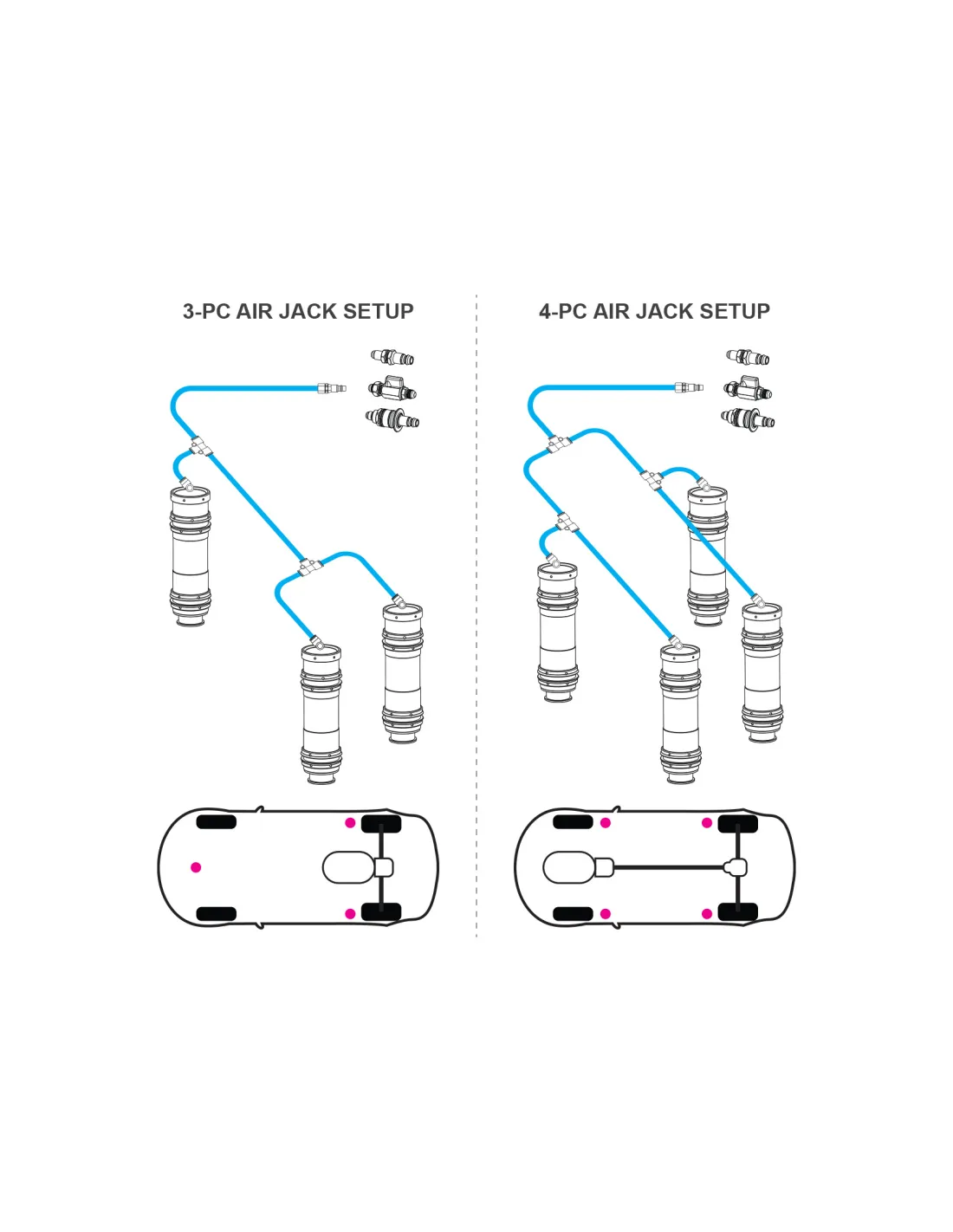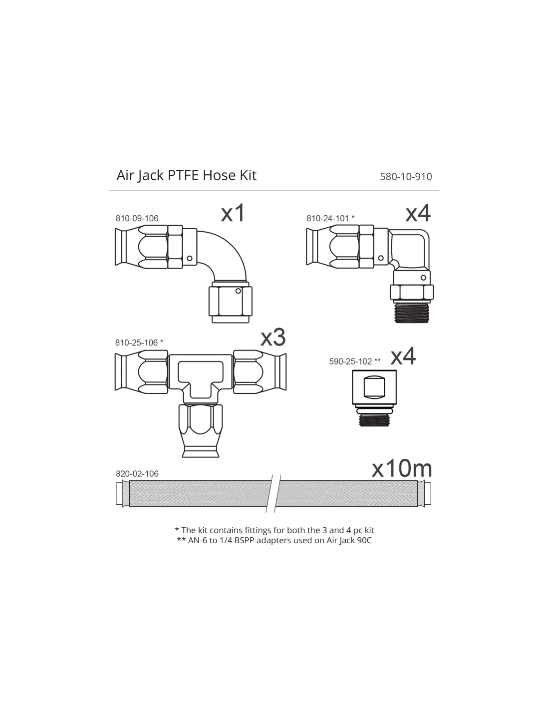 L'installation des vérins pneumatiques Nuke Performance Air Jack 60C est simplifiée grùce à ce kit de tuyaux en PTFE, conçu pour une pression de 8 à 30 bars (120 à 435 psi). Il comprend tout le nécessaire pour une configuration de vérin pneumatique en 3 ou 4 piÚces, permettant une connexion parfaite entre la valve choisie et les vérins.