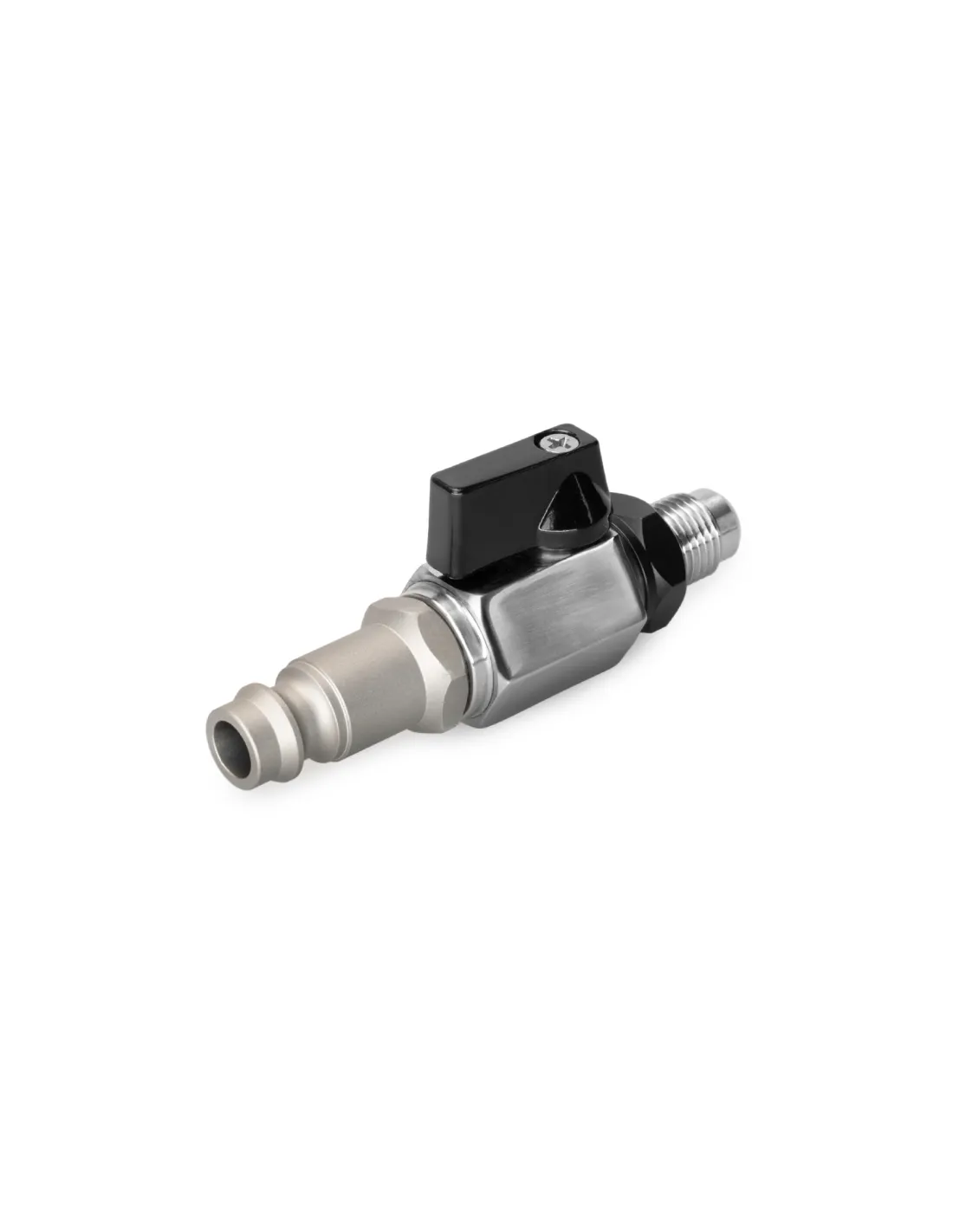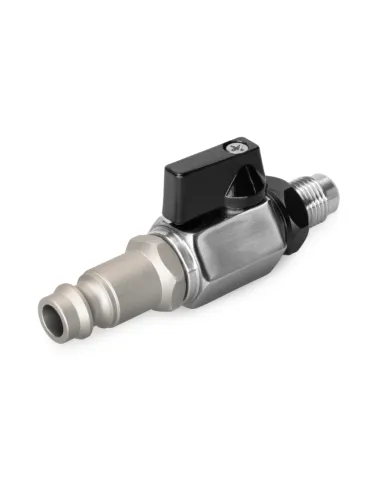 Cette vanne à bille permet de maintenir la pression dans le système, même lorsque la lance du vérin pneumatique est retirée. Son ouverture progressive offre un contrôle précis lors de la descente du vérin, si nécessaire. Lorsque la vanne est ouverte et que la lance est retirée, le vérin se désengage immédiatement dès que la pression chute.