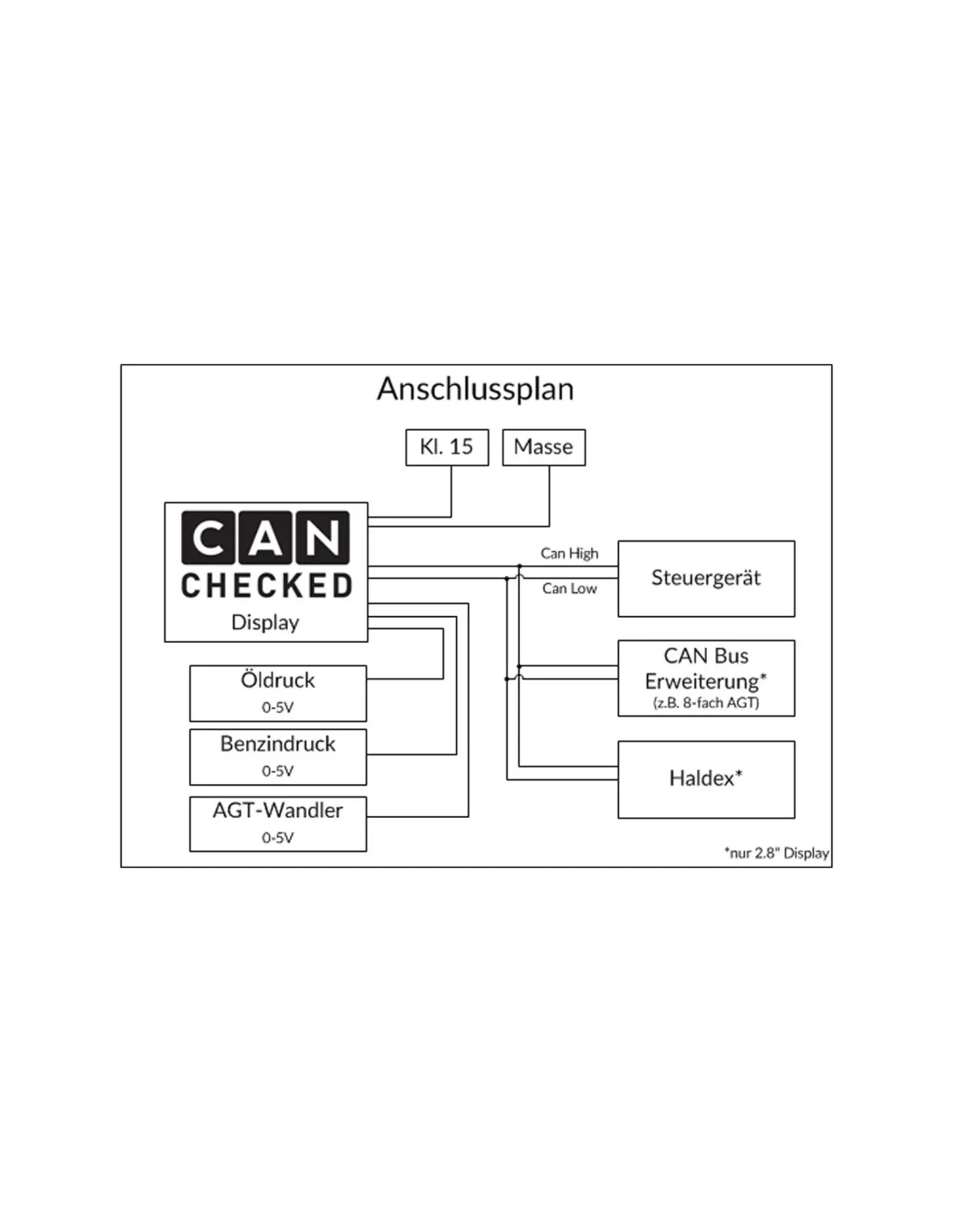 Qu'est-ce que CANchecked ? Les affichages, les jauges, les logiciels et les capteurs CANchecked permettent la représentation visuelle des données moteur importantes, telles que la température de l'huile, la pression de suralimentation, la valeur lambda, la température des gaz d'échappement, etc. Cela peut être fait soit via le Can Bus (selon les valeurs de l'ECU), soit via des capteurs analogiques supplémentaires.