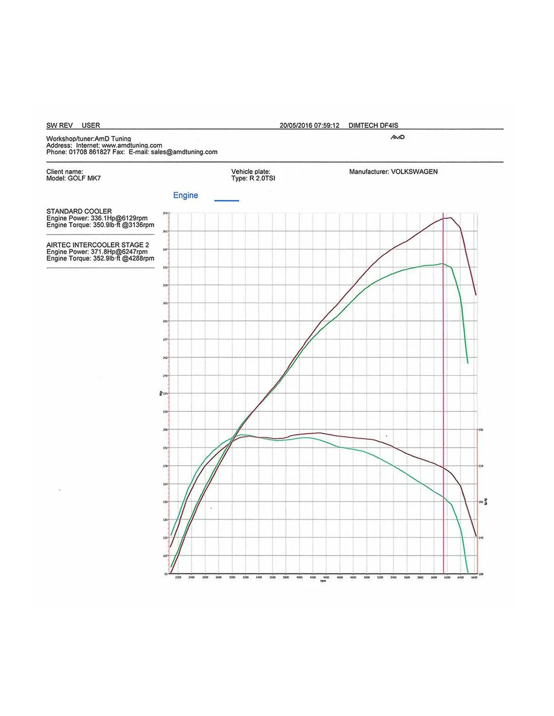 Avec l'intercooler AIRTEC monté, la température d'admission a connu une énorme chute de 120 degrés, maintenant les températures beaucoup plus proches de la température ambiante et assurant une fiabilité accrue run après run. Cela a entraîné une énorme augmentation des performances, comme en témoignent les résultats des tests du banc d'essai AmD Tuning.