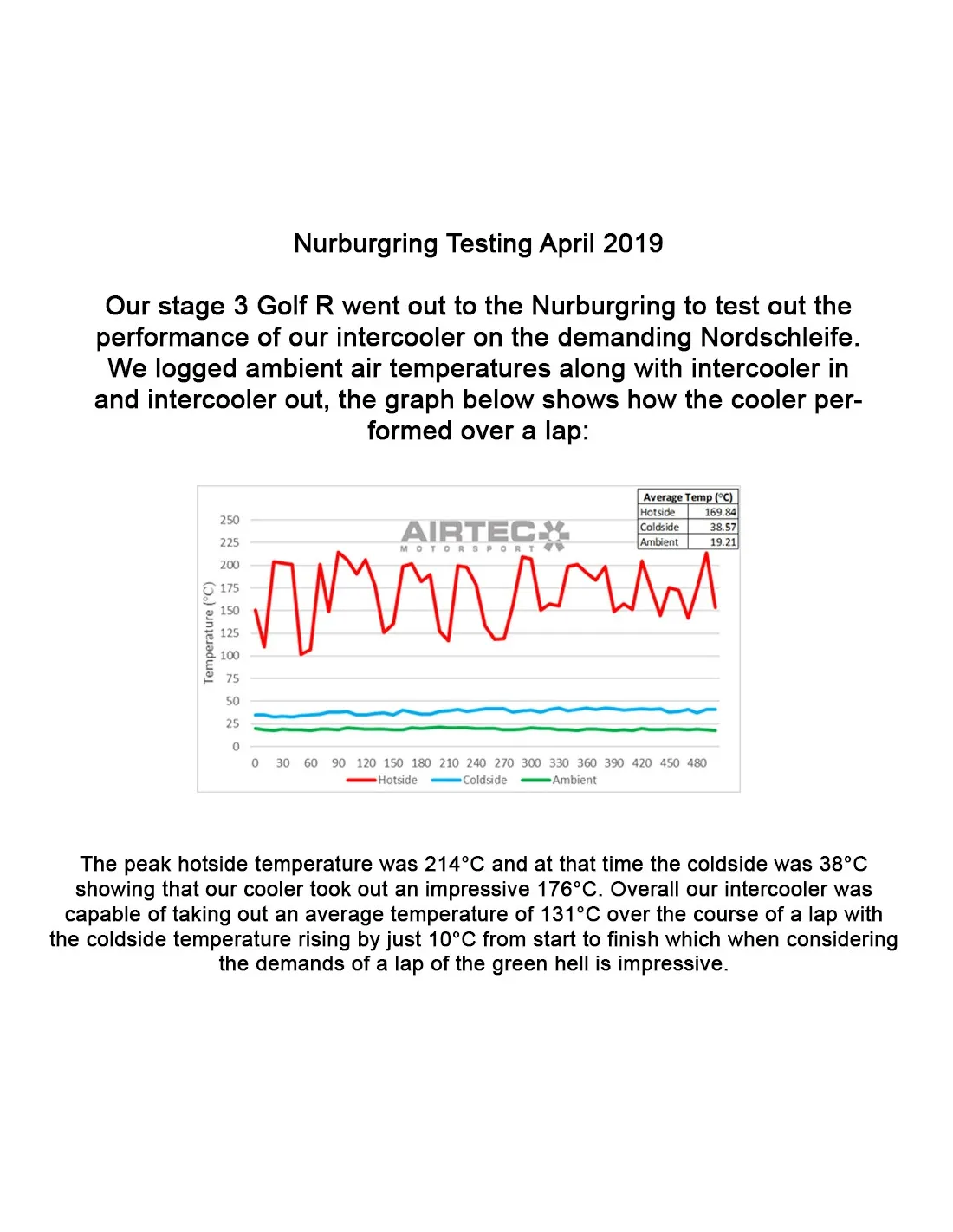Les températures de l'intercooler d'origine sont passées en moyenne à 64 degrés et ont atteint un maximum de 68 degrés (après 5 runs consécutifs). Avec le logiciel Stage 1 Revo, la voiture a eu du mal à produire un pic de puissance supplémentaire de 40 ch, en raison de l'intercooler VW OEM restrictif et inefficace qui ne parvenait pas à refroidir efficacement les températures d'admission.