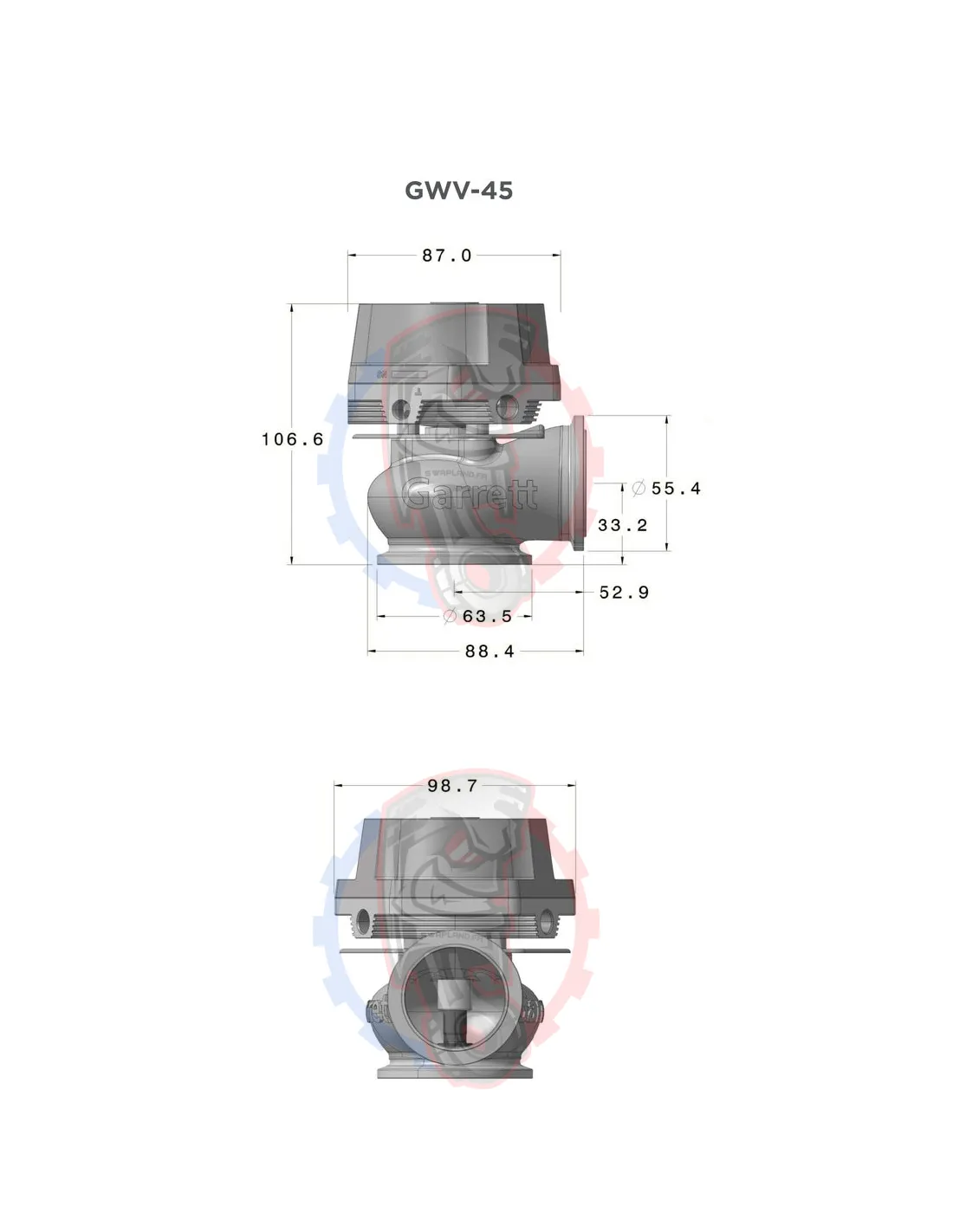 La wastegate Garrett GVW-45 Rouge est moulée dans de l'acier inoxydable résistant aux hautes températures et elle est conçue pour résister à des températures de gaz maximum 1050 C°.