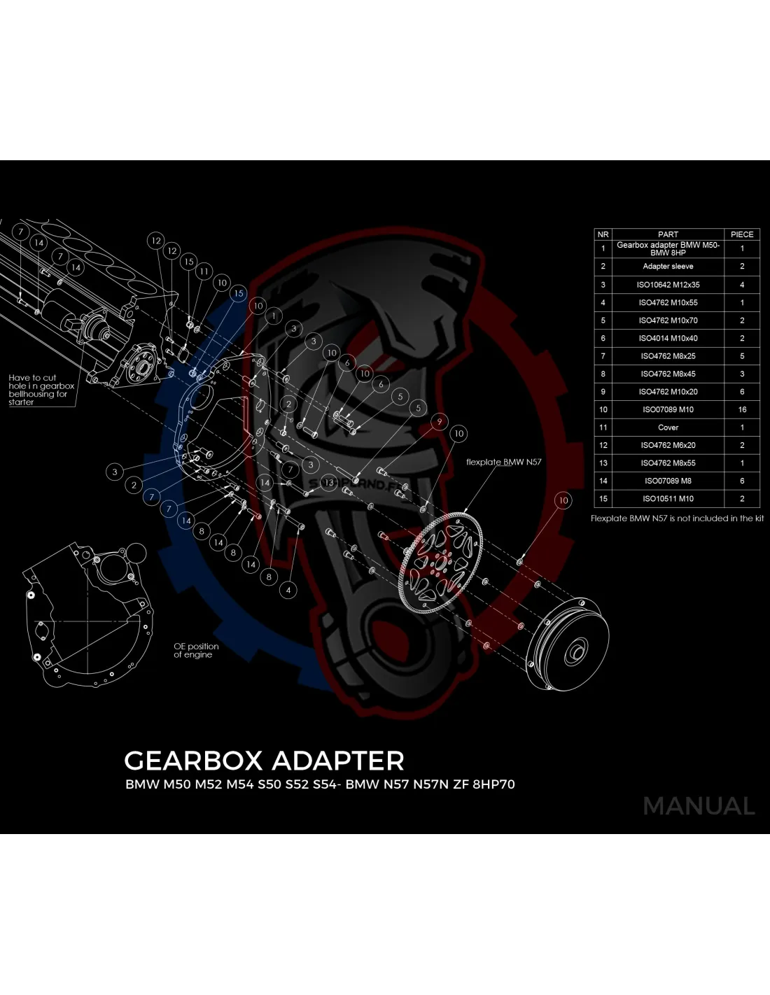 L'adaptateur en aluminium est conçu pour la conversion des moteurs BMW M50 M52 M54 S50 S52 S54 (E36 / E36 M3 / E46 / E46 M3 / E39 / E38 / E60) avec les boîtes de vitesses BMW ZF 8HP70 BMW N57 N57n Diesel / B58 ZF 8HP50 essence (8 vitesses) et la boîte de vitesses manuelle à 6 vitesses ZF GS6-53DZ des BMW M57N M57N2.