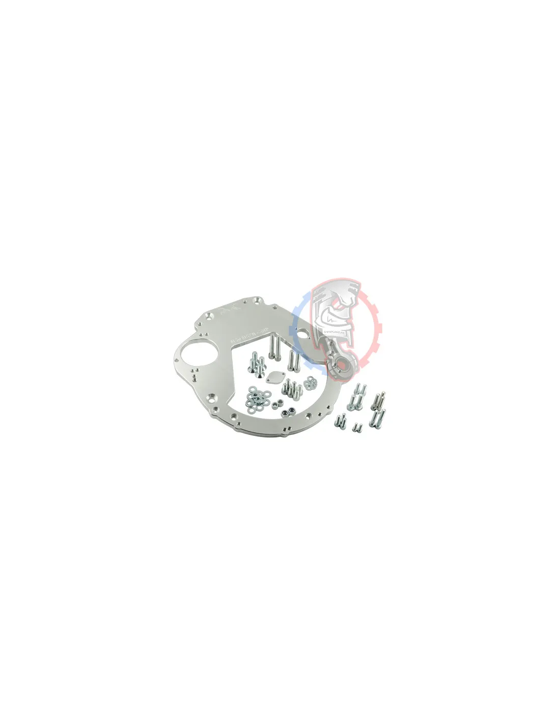 - Détail produit : Plaque d'adaptation de boîte de vitesses en aluminium, boulons de la plaque d'adaptation de boîte de vitesses et goupilles de positionnement.