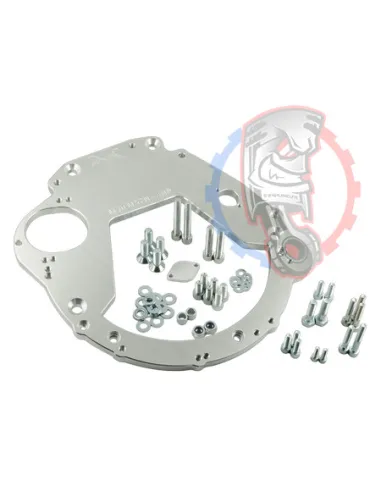 - Détail produit : Plaque d'adaptation de boîte de vitesses en aluminium, boulons de la plaque d'adaptation de boîte de vitesses et goupilles de positionnement.