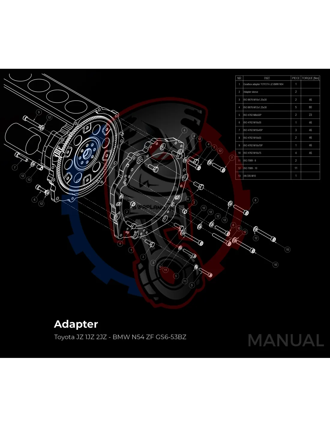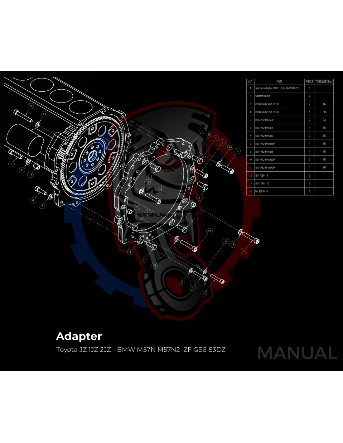 Plaque d'adaptation en aluminium conçue pour associer le moteur Toyota JZ 1JZ 2JZ à la boîte de vitesses manuelle BMW ZF / GETRAG ou à la boîte de vitesses ZF 8HP 8HP70 de BMW N57 N57N et à la boîte à double embrayage DCT DKG de BMW.