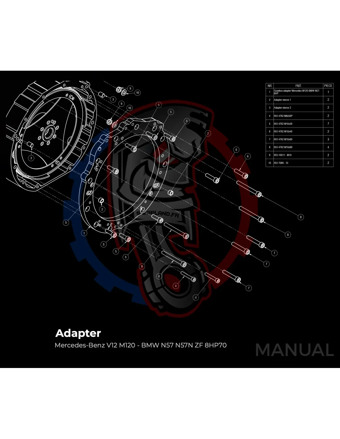 - Détail produit : Adaptateur de boîte de vitesses en aluminium, boulons d'adaptateur de boîte de vitesses, goupilles d'alignement.