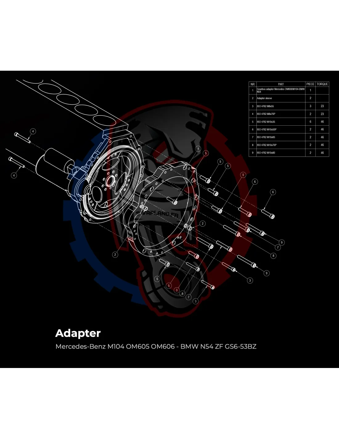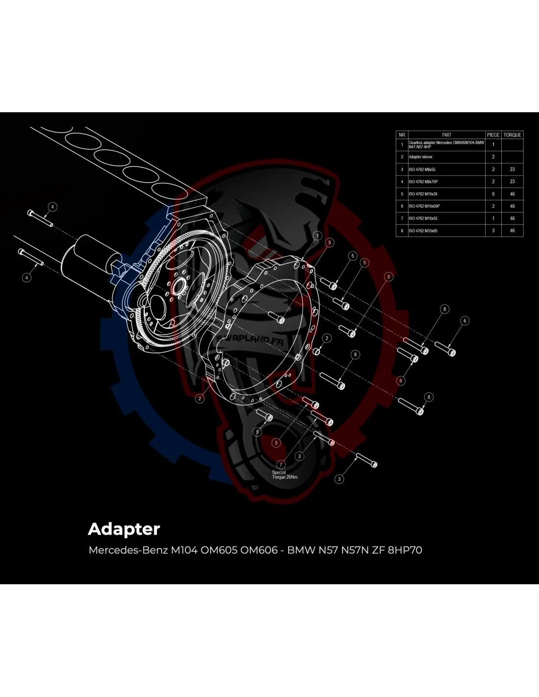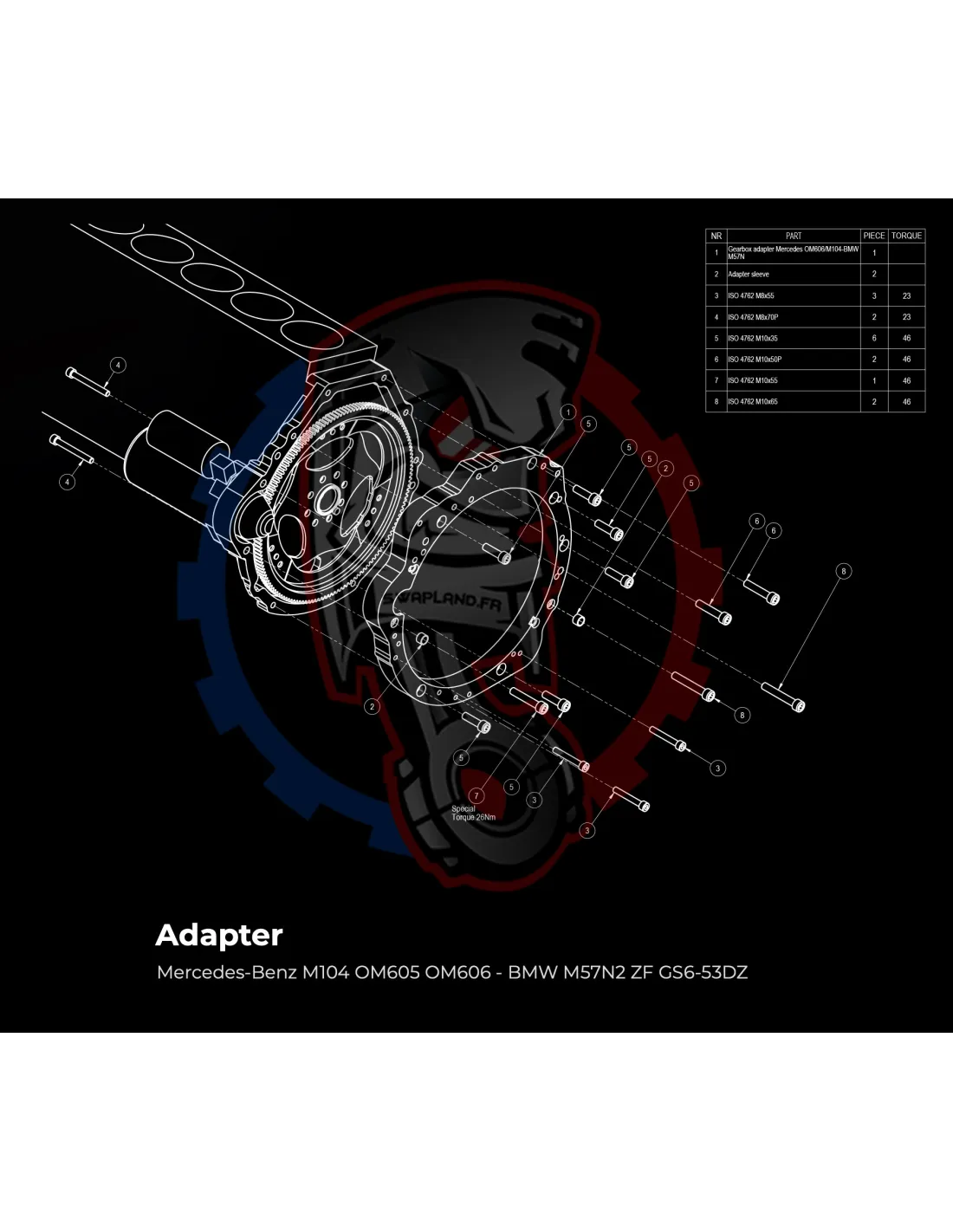 - Détail produit : Adaptateur de boîte de vitesses en aluminium, boulons d'adaptateur de boîte de vitesses, goupilles d'alignement.