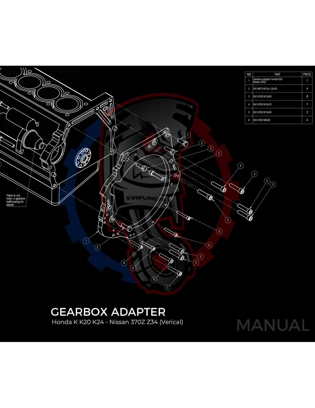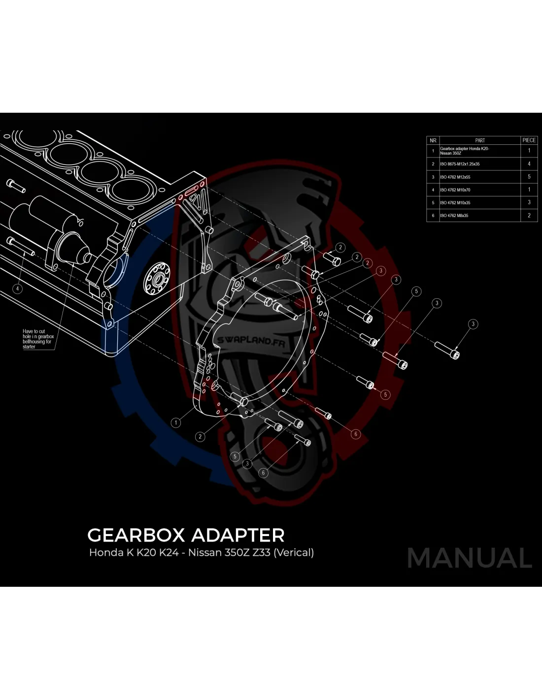 - Épaisseur de la plaque d'adaptation de boîte de vitesses : 20 mm.