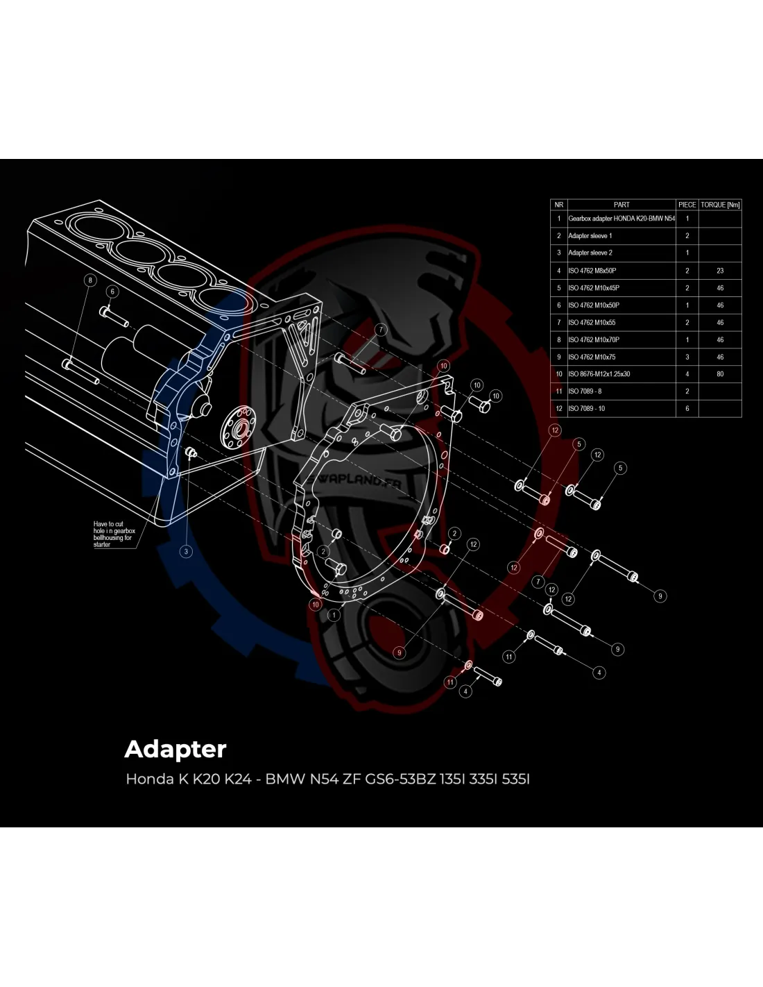 - Détail produit : Adaptateur de boîte de vitesses en aluminium, boulons d'adaptateur de boîte de vitesses.