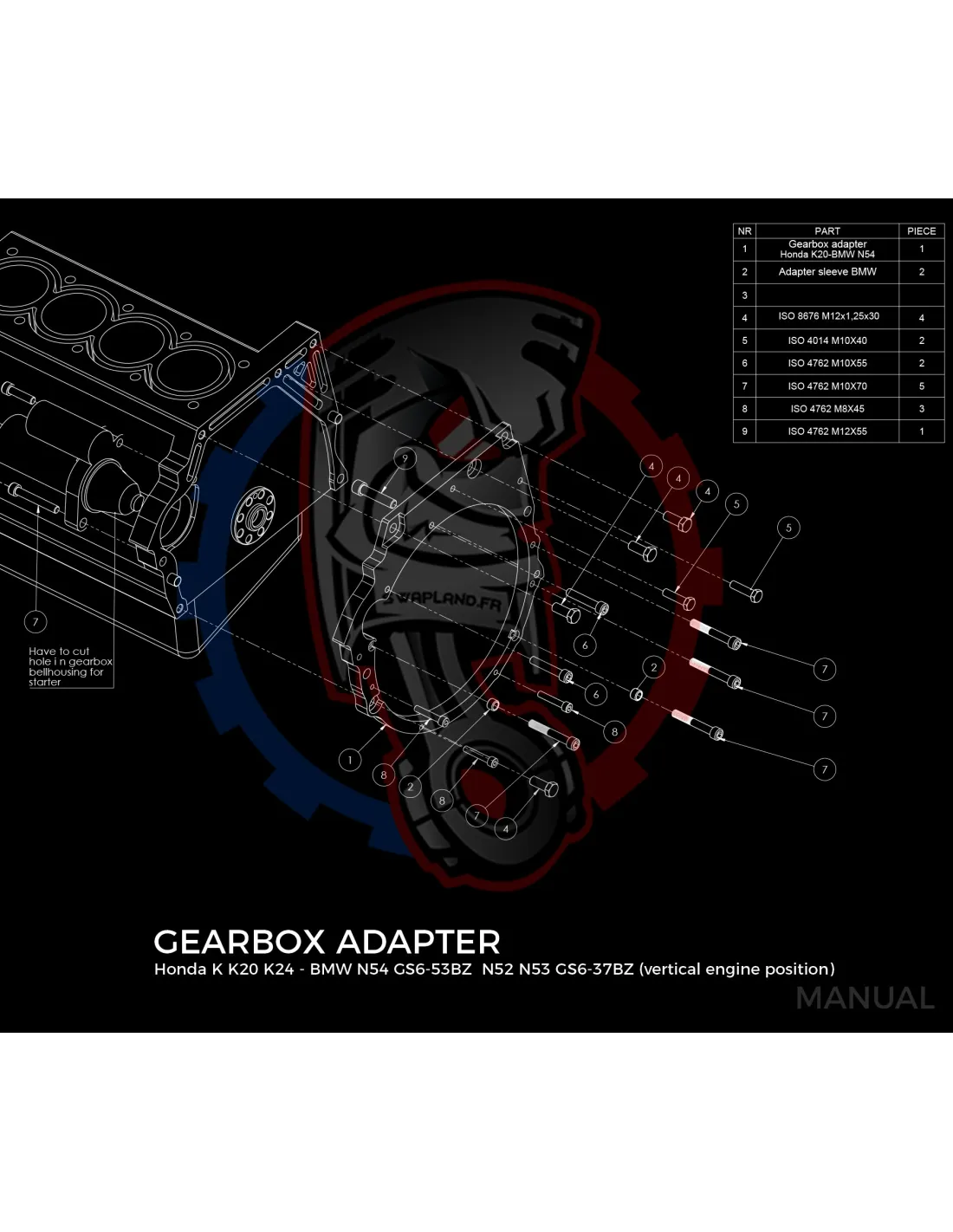 - Épaisseur de la plaque d'adaptation de boîte de vitesses : 20 mm.