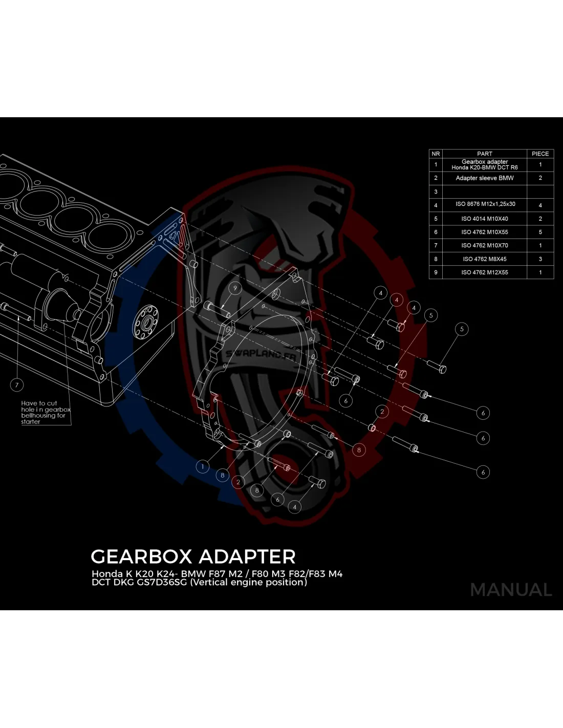 Plaque de conversion de boîte de vitesses F87 M2 / F80 M3 F82 / F83 M4 DCT DKG GS7D36SG R6 (position verticale du moteur) pour moteur Honda K K20 K24 :