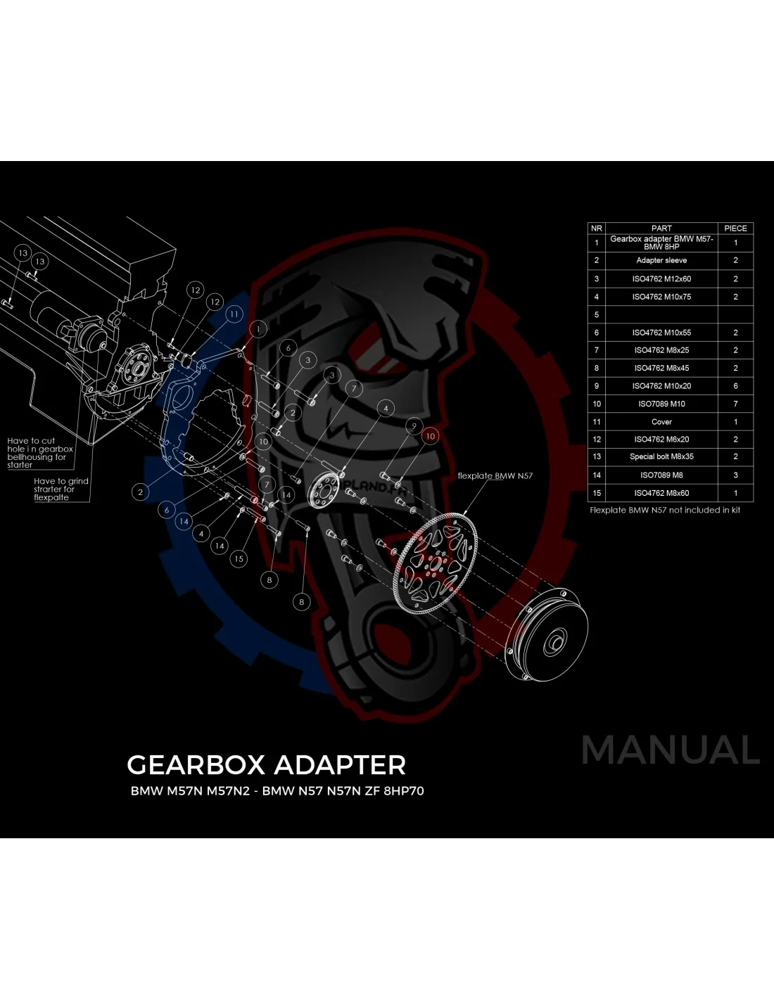 - Épaisseur de la plaque d'adaptation de boîte de vitesses : 15 mm.
