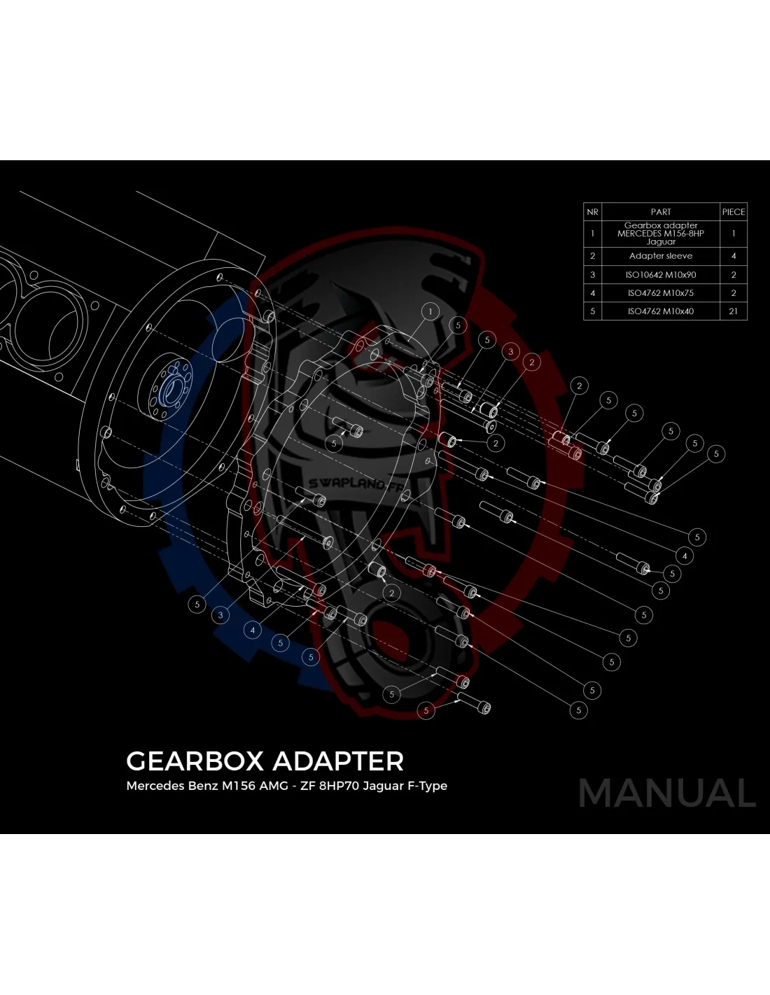 - Détail produit : Adaptateur de boîte de vitesses en aluminium, boulons d'adaptateur de boîte de vitesses, goupilles de centrage.