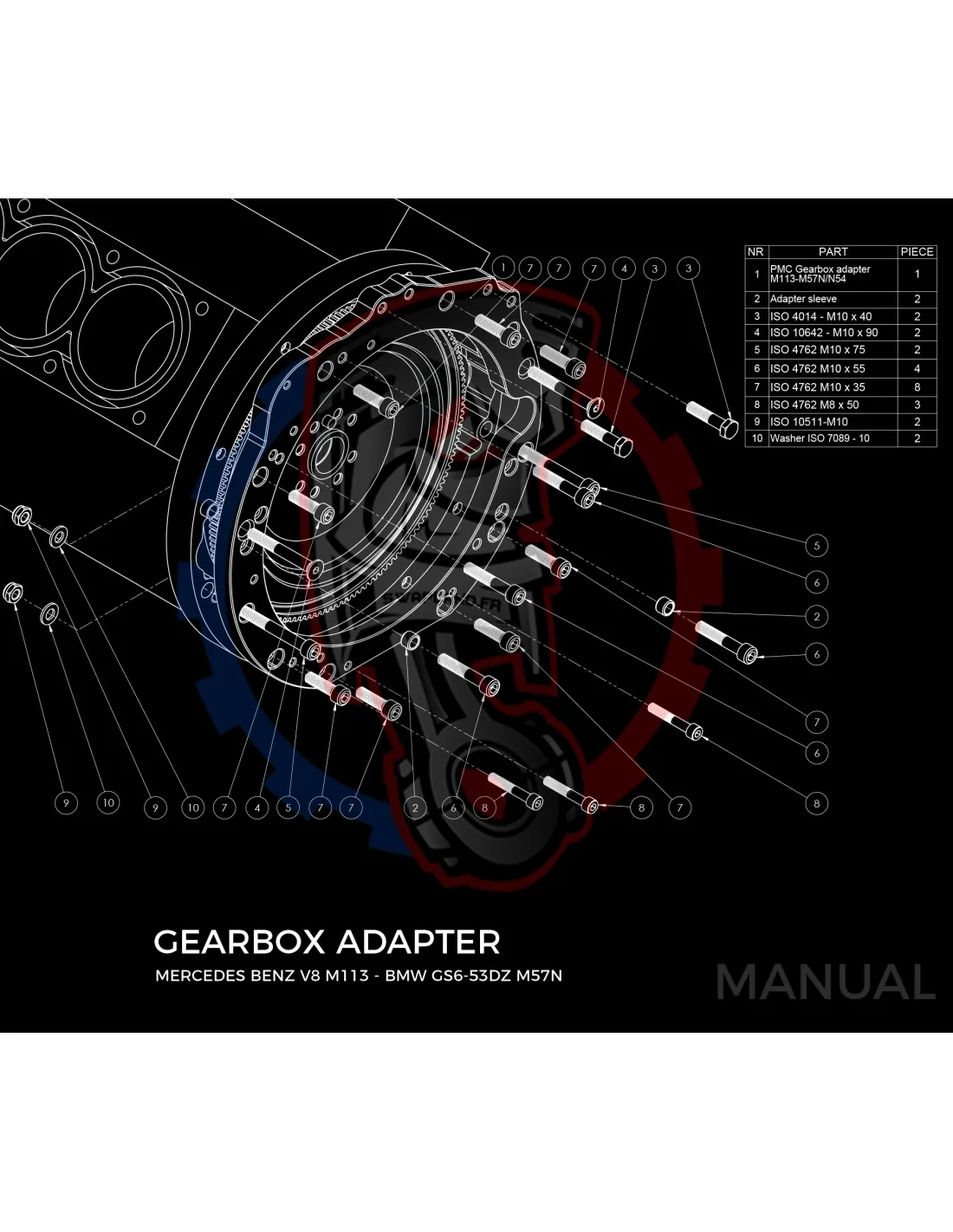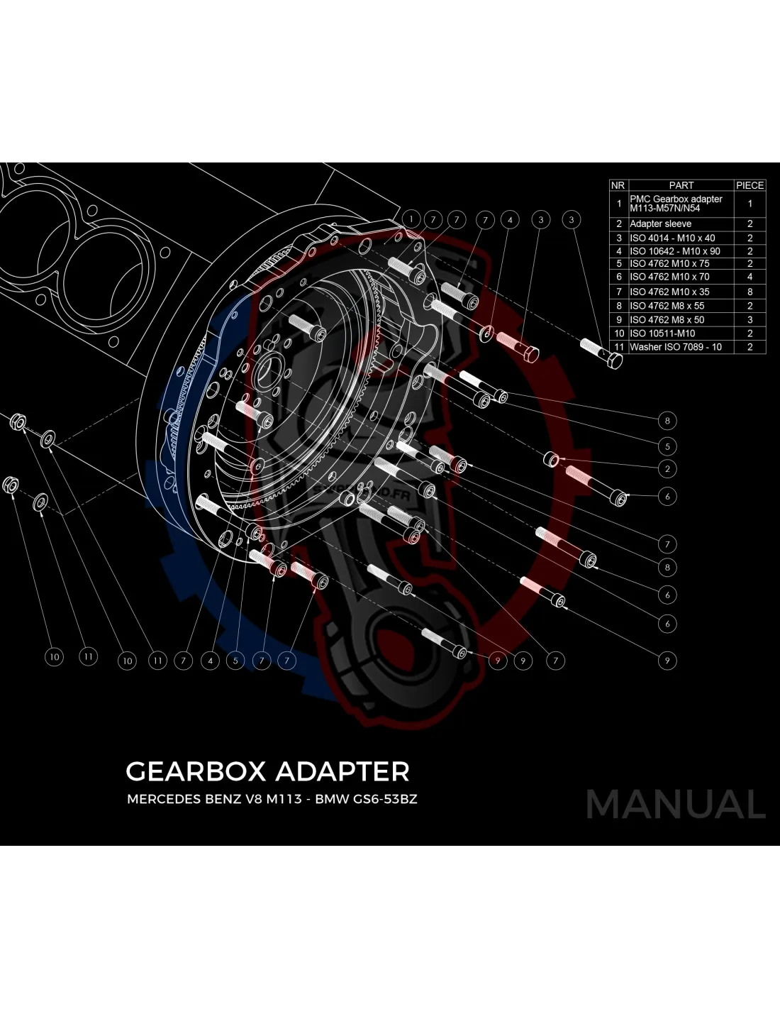 - Détail produit : Adaptateur de boîte de vitesses en aluminium, boulons d'adaptateur de boîte de vitesses, goupilles de centrage.