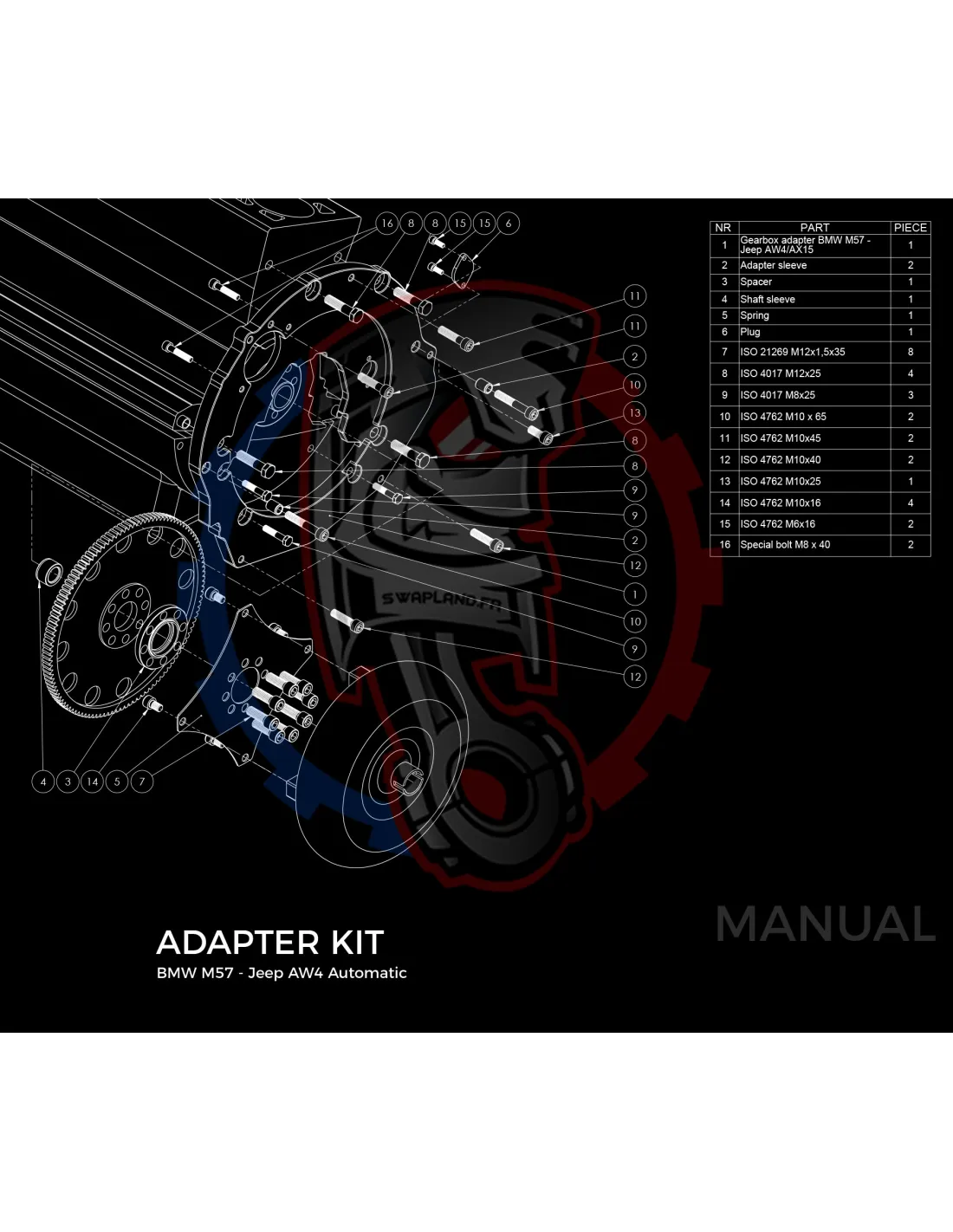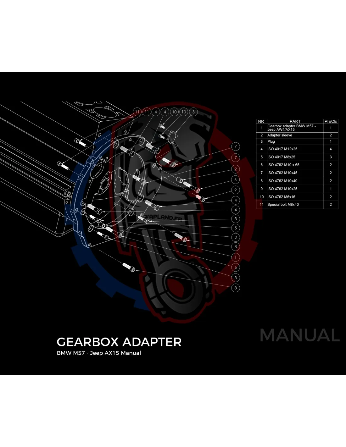 Plaque de conversion de boîte de vitesses Jeep XJ Cherokee AX15 manuelle / AW4 automatique pour moteur BMW M57 3L Diesel :