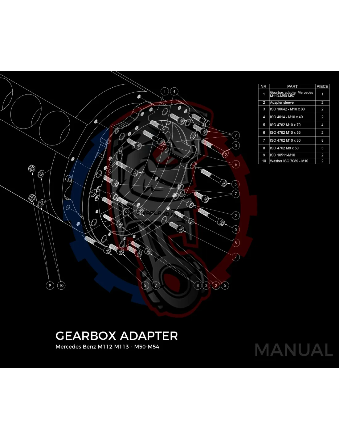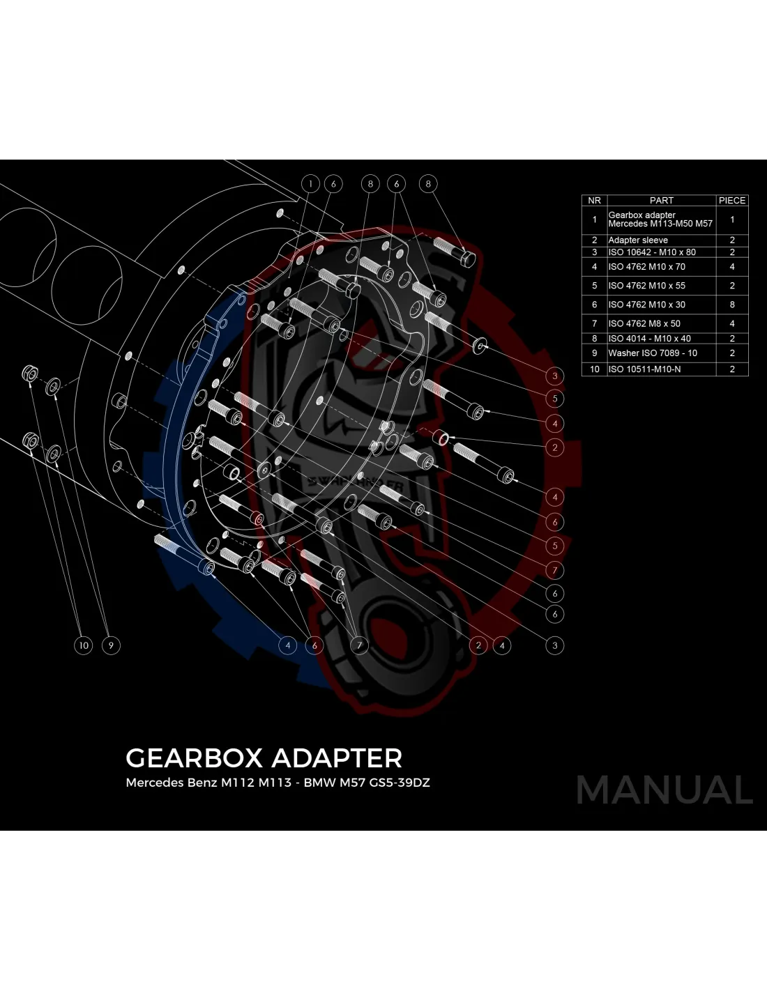 Plaque d'adaptation pour boite de vitesses BMW ZF310 / ZF320 / ZF GS5-39DZ / Getrag420G / ZF GS6-37DZ / ZF GS6-53DZ HGA sur moteur Mercedes-Benz V8 M113 / V6 M112.