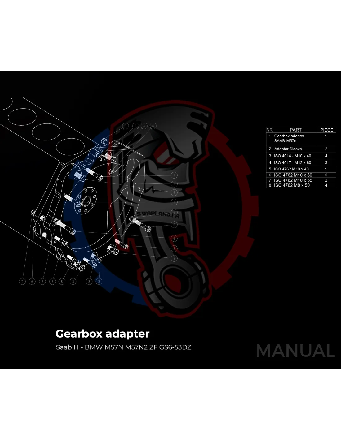 - Détail produit : Adaptateur de boîte de vitesses en aluminium, boulons d'adaptateur de boîte de vitesses, goupilles de centrage.