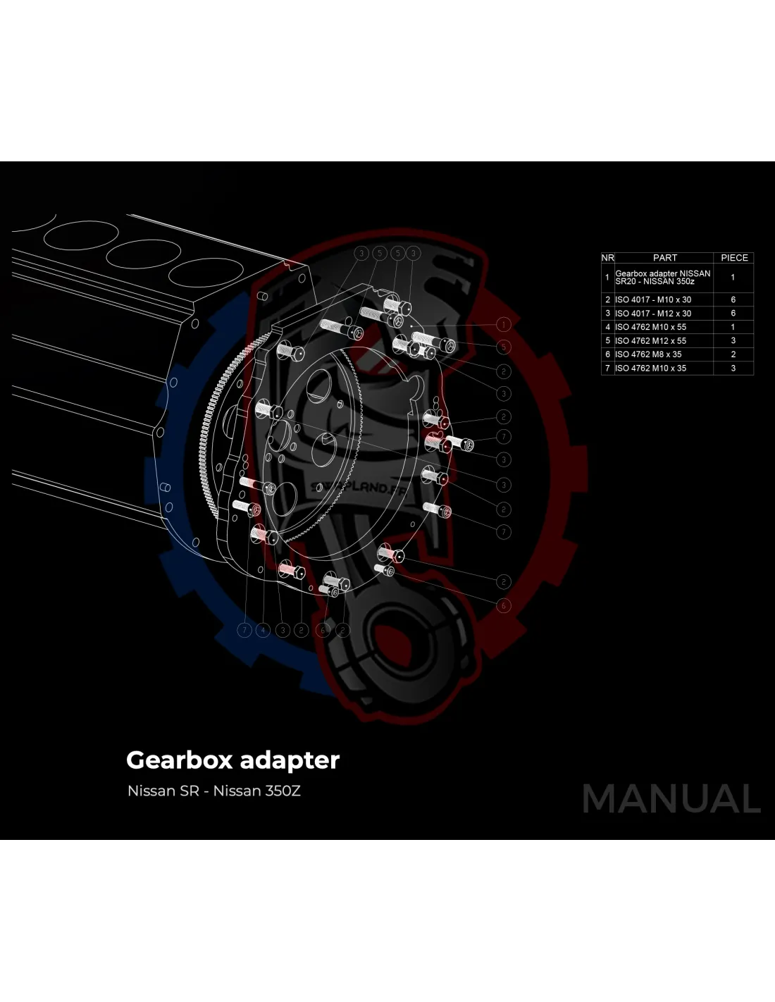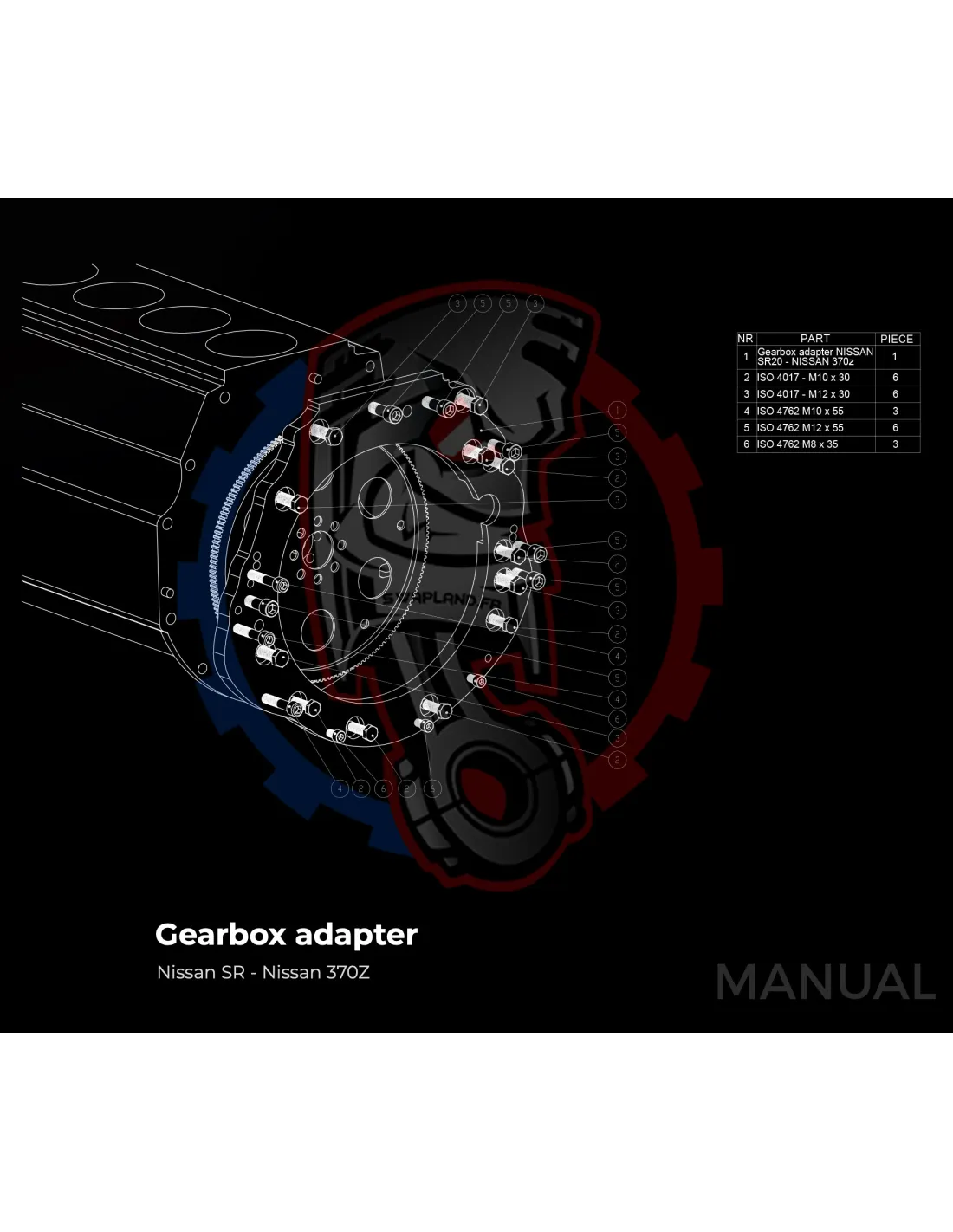 - Détail produit : Adaptateur de boîte de vitesses en aluminium, boulons d'adaptateur de boîte de vitesses, goupilles de centrage.