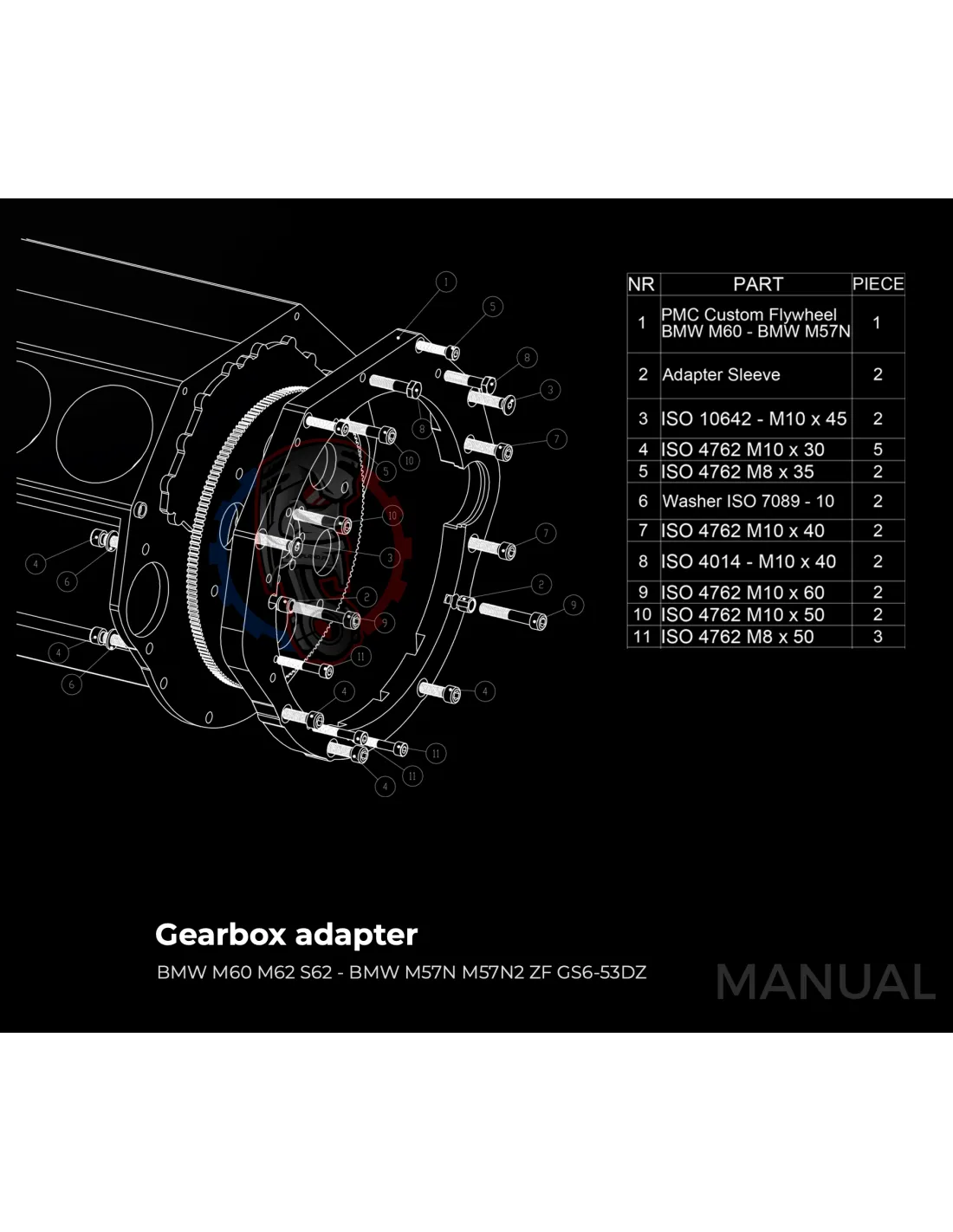 Le kit permet de monter sur un moteur BMW M62 S62 une boite de vitesse BMW M57N HGU HGK facilement avec sa plaque d'adaptation.