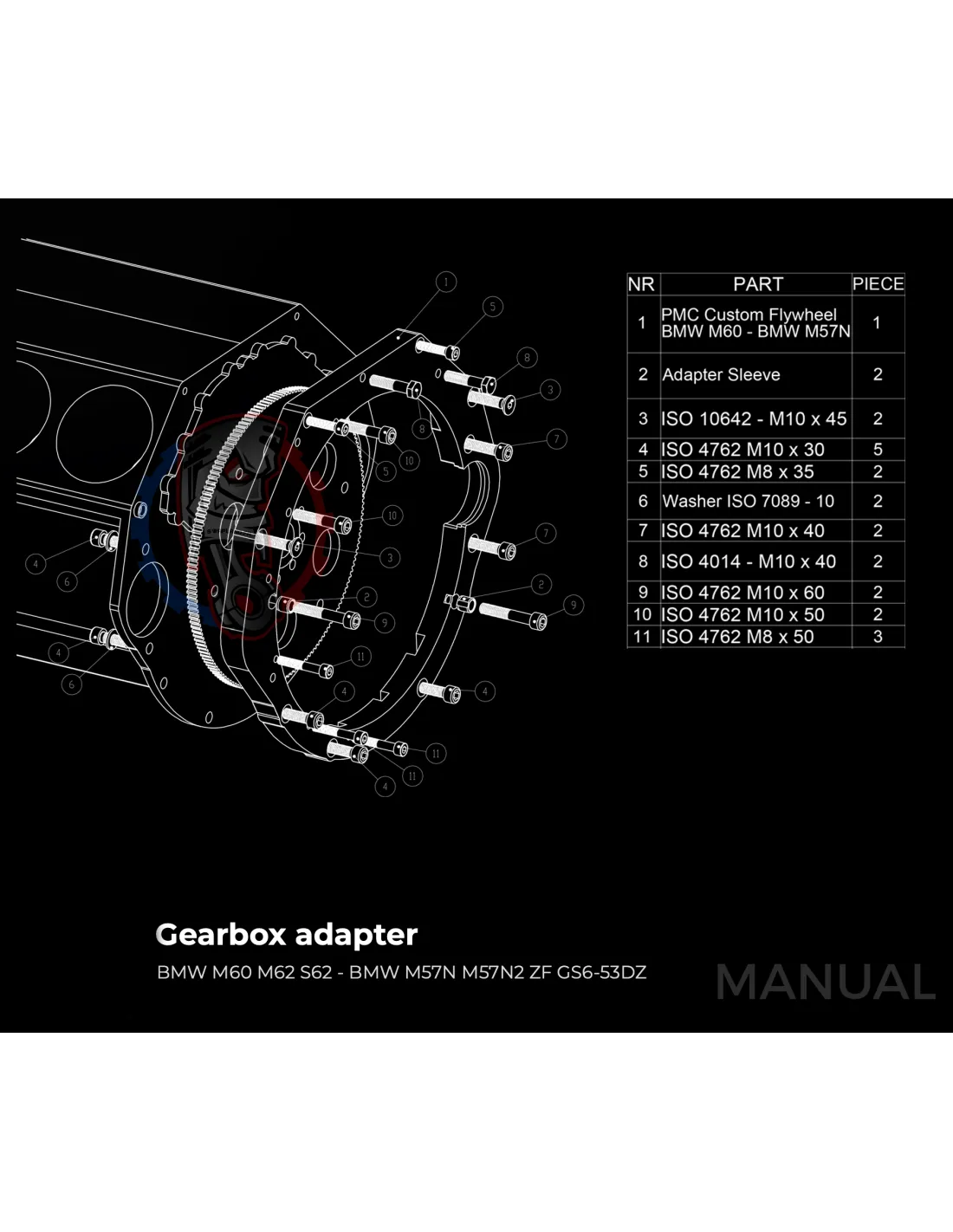 Le kit permet de monter sur un moteur BMW M62 S62 une boite de vitesse BMW M57N HGD JGA facilement avec sa plaque d'adaptation.
