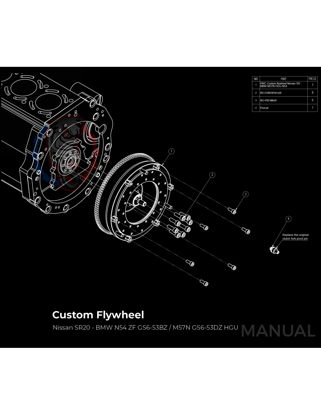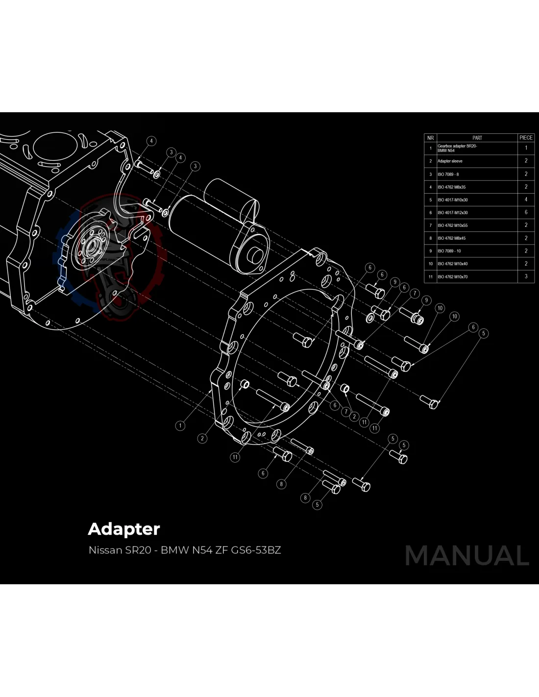 Le kit permet de monter sur un moteur Nissan SR une boite de vitesse BMW N54 facilement avec sa plaque d'adaptation.