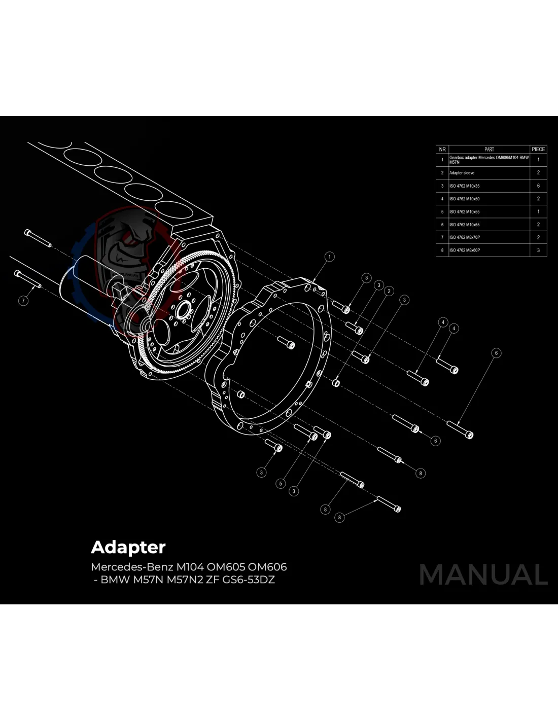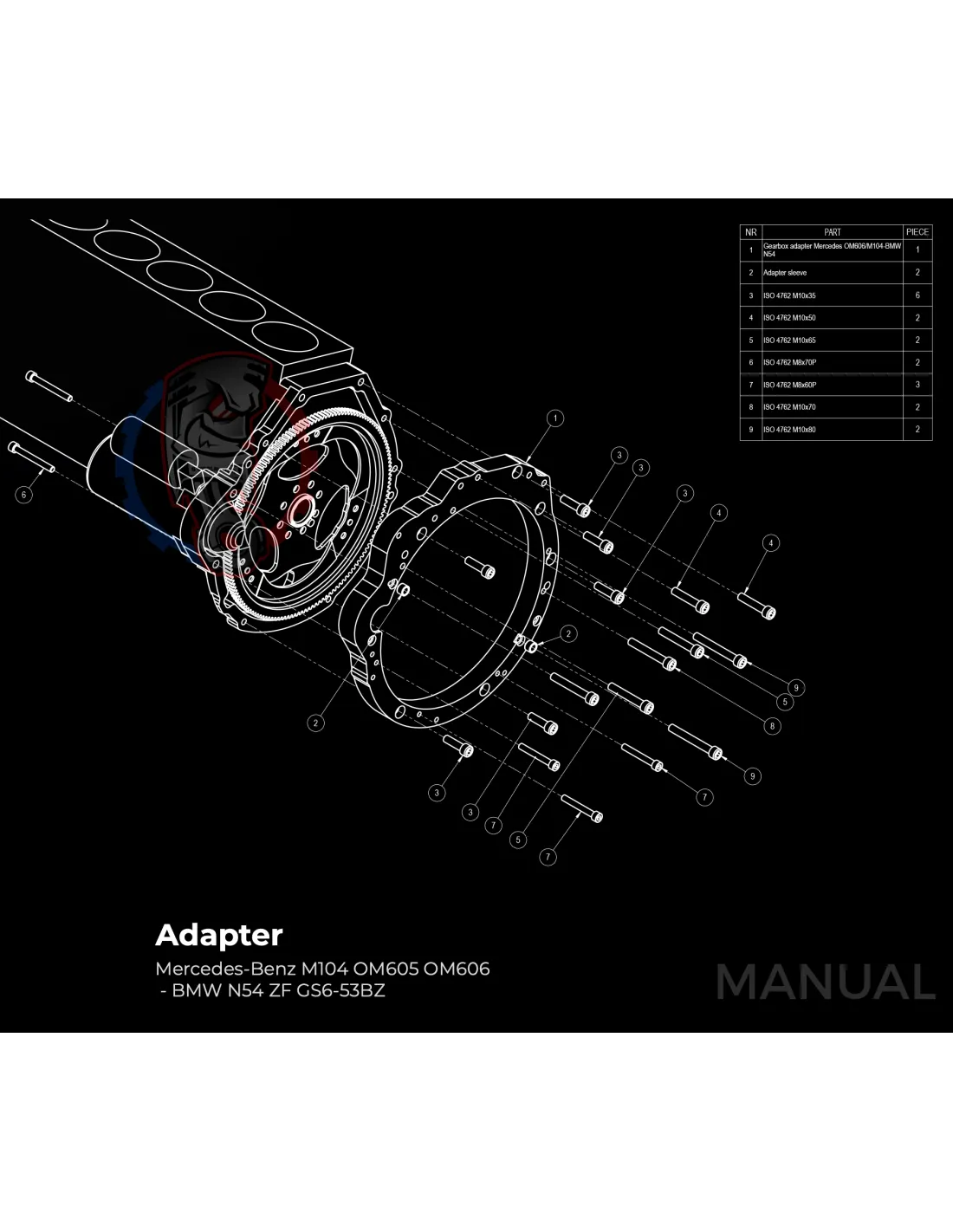 Le kit permet de monter sur un moteur Mercedes-Benz M104 OM605 OM606 une boite de vitesse BMW M57N HGU HGK / N54 facilement avec sa plaque d'adaptation.