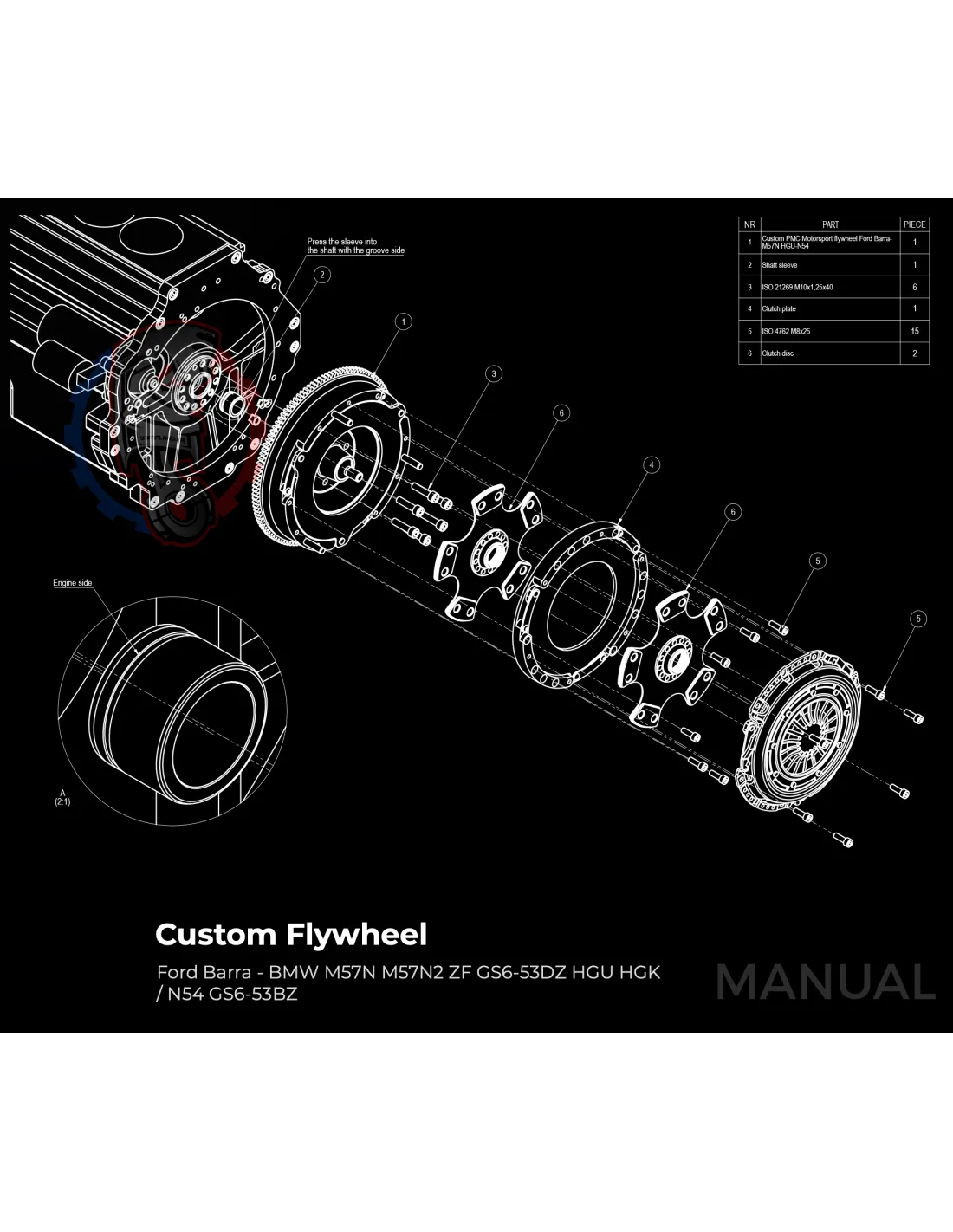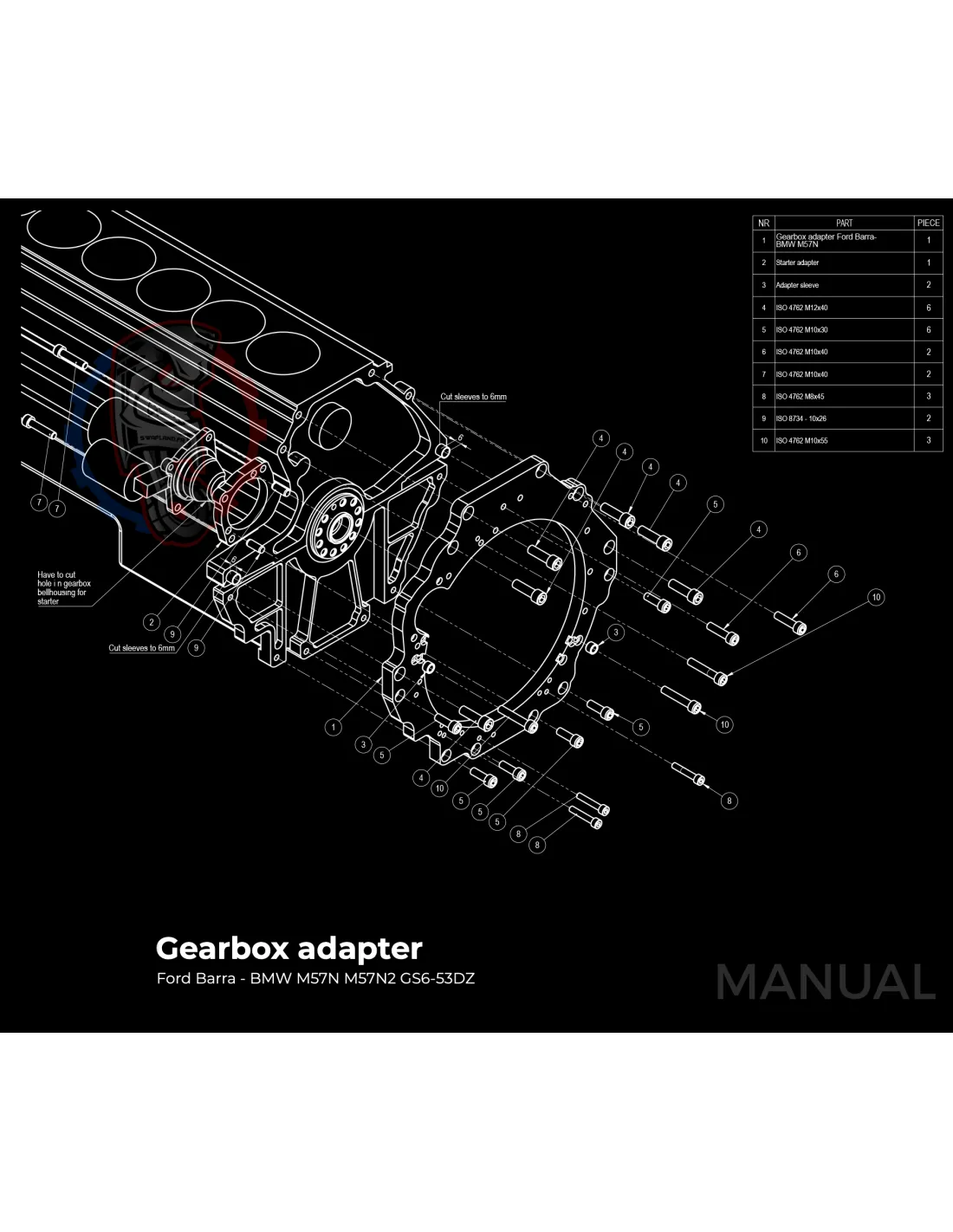 Le kit permet de monter sur un moteur Ford Barra une boite de vitesse BMW M57N HGU HGK / N54 facilement avec sa plaque d'adaptation.