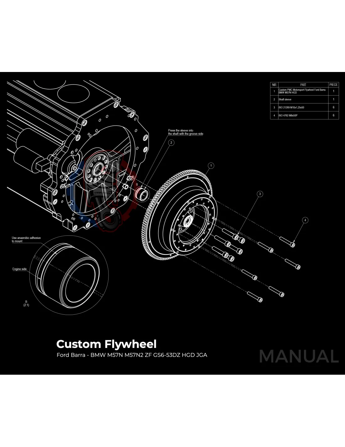 Le kit permet de monter sur un moteur Ford Barra une boite de vitesse BMW M57N HGD JGA HGA facilement avec sa plaque d'adaptation.