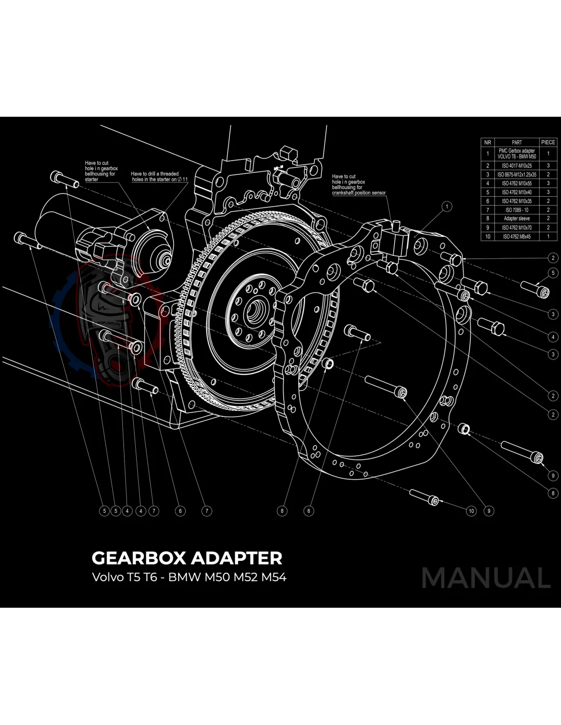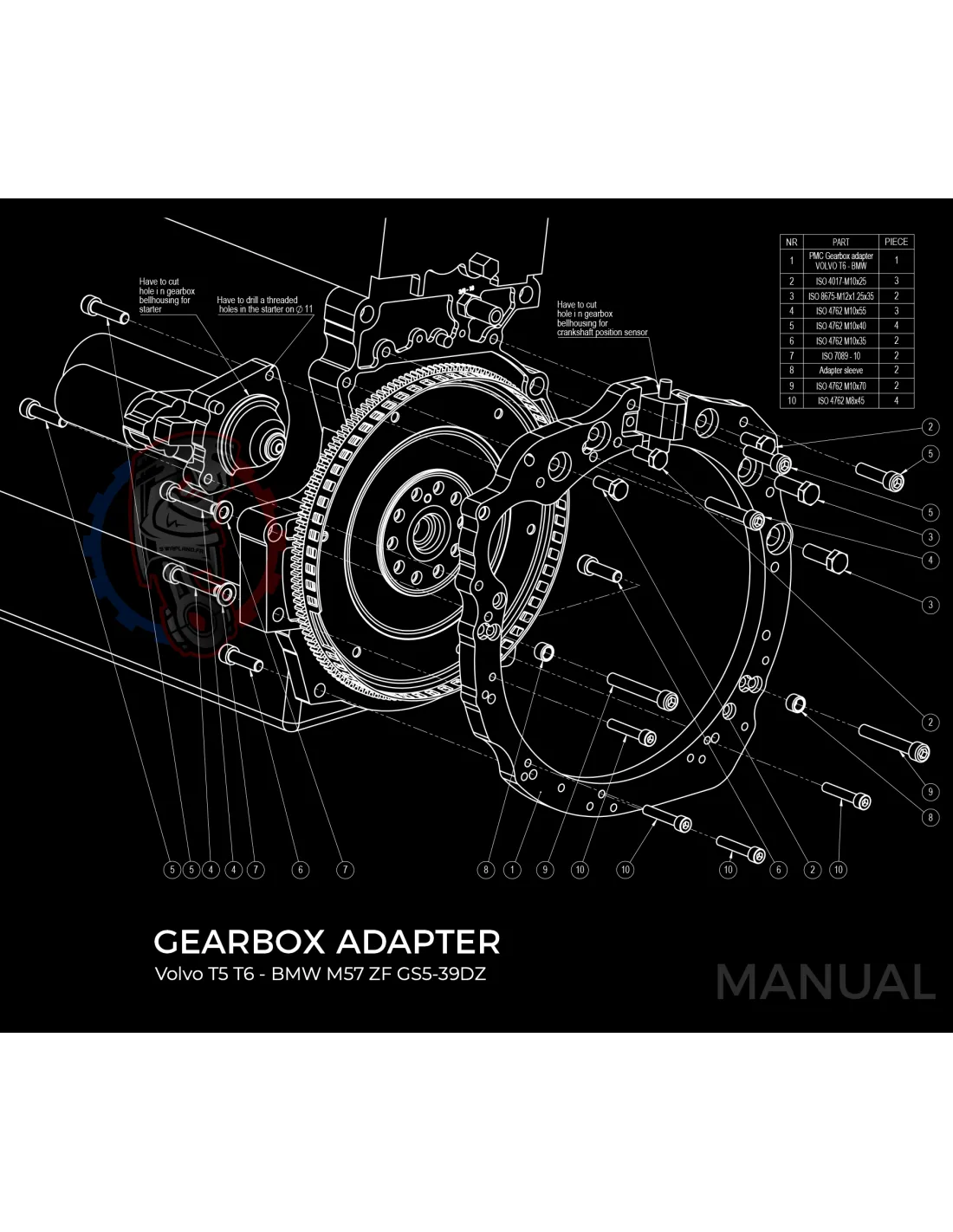 Kit conversion Stage 1 moteur Volvo Modular Whiteblock T5 T6 pour boite de vitesse BMW M57N HGU HGK / N54 240mm