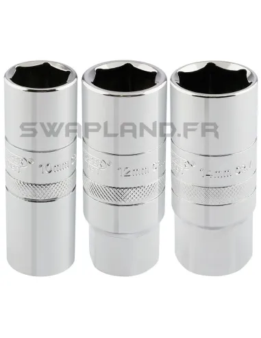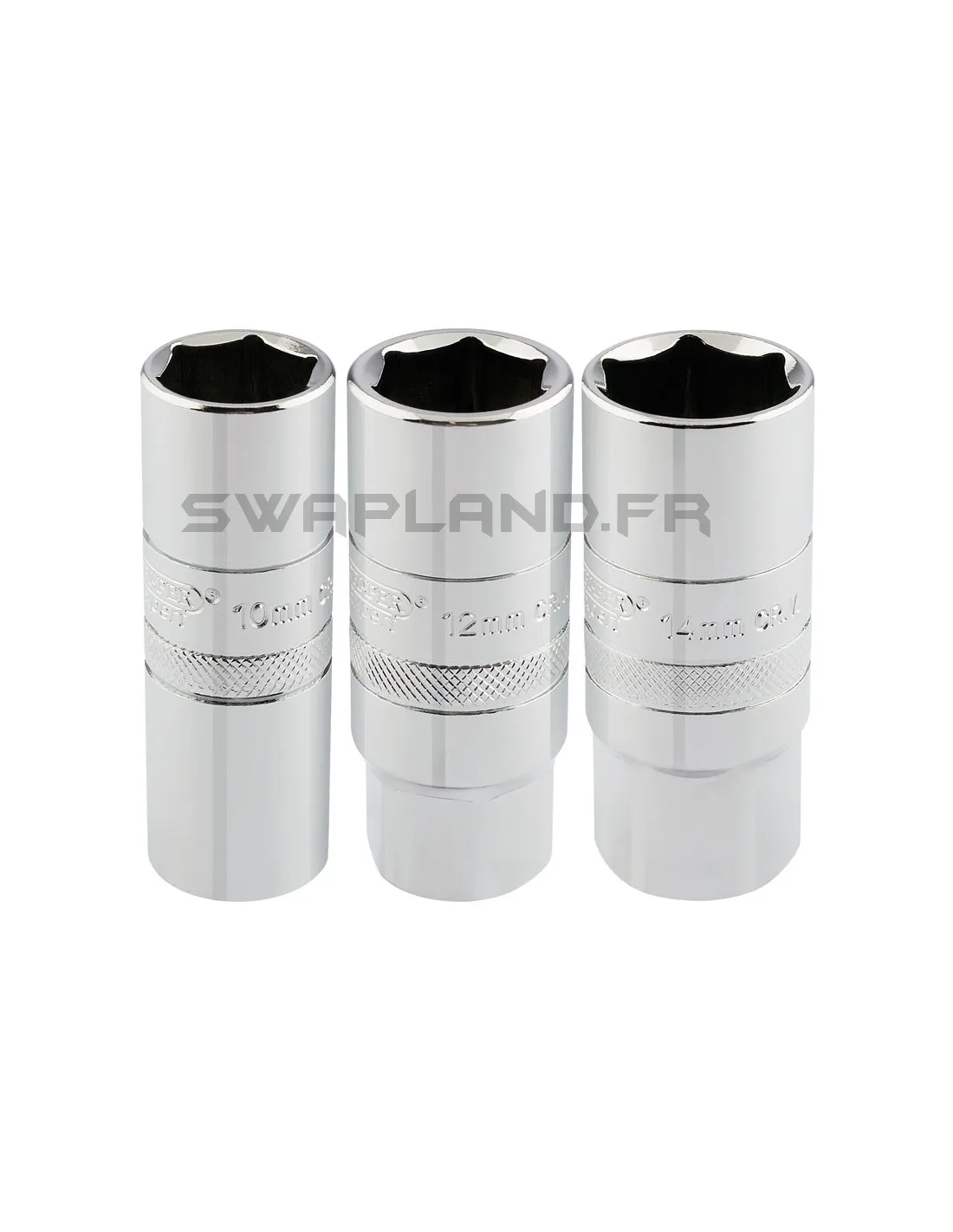 Set de 3 douilles à bougie 16, 18 et 21 mm. Chaque douille dispose d'une bague nervurée offrant un meilleur grip.