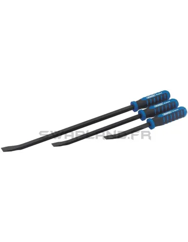 Jeu de tournevis à lames plates larges coudées spécialement conçus pour séparer les demi-carters sans endommager les plans de joints.