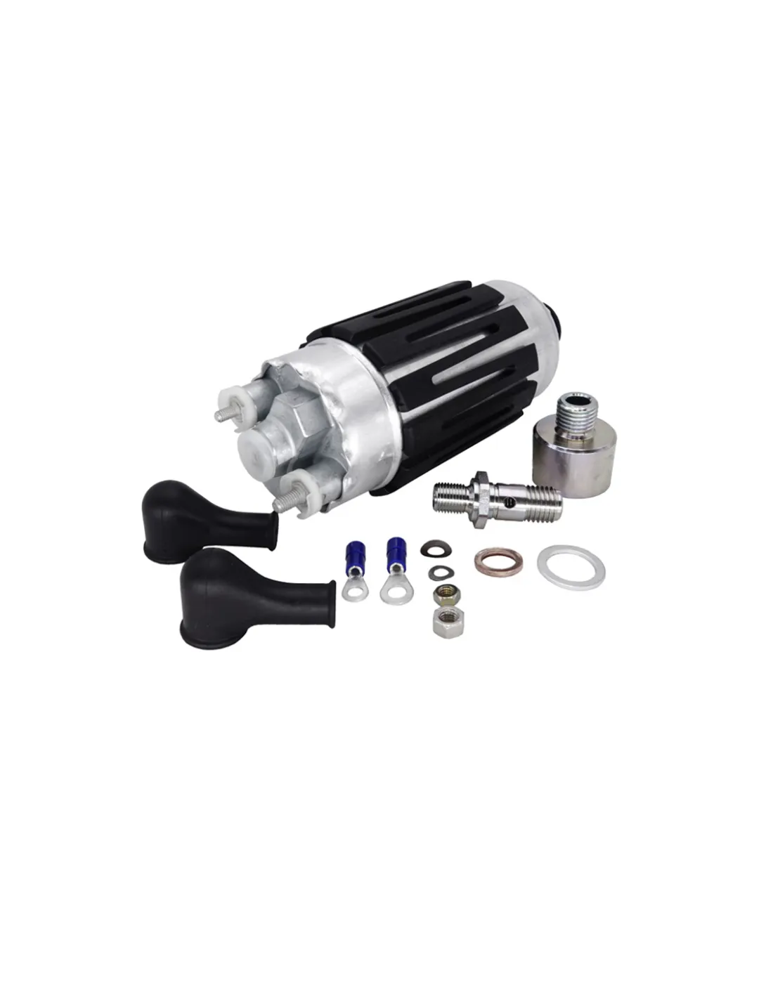 Compatible avec les carburants alcoolisés (comme l’éthanol E85), elle conserve cependant une durée de vie plus longue avec l’essence. Son diamètre est de 52 mm, mais elle est fournie avec un adaptateur plastique de 60 mm, lui permettant de s’adapter parfaitement à tous les supports conçus pour la Bosch 044, y compris les colliers simples et doubles de Nuke Performance.