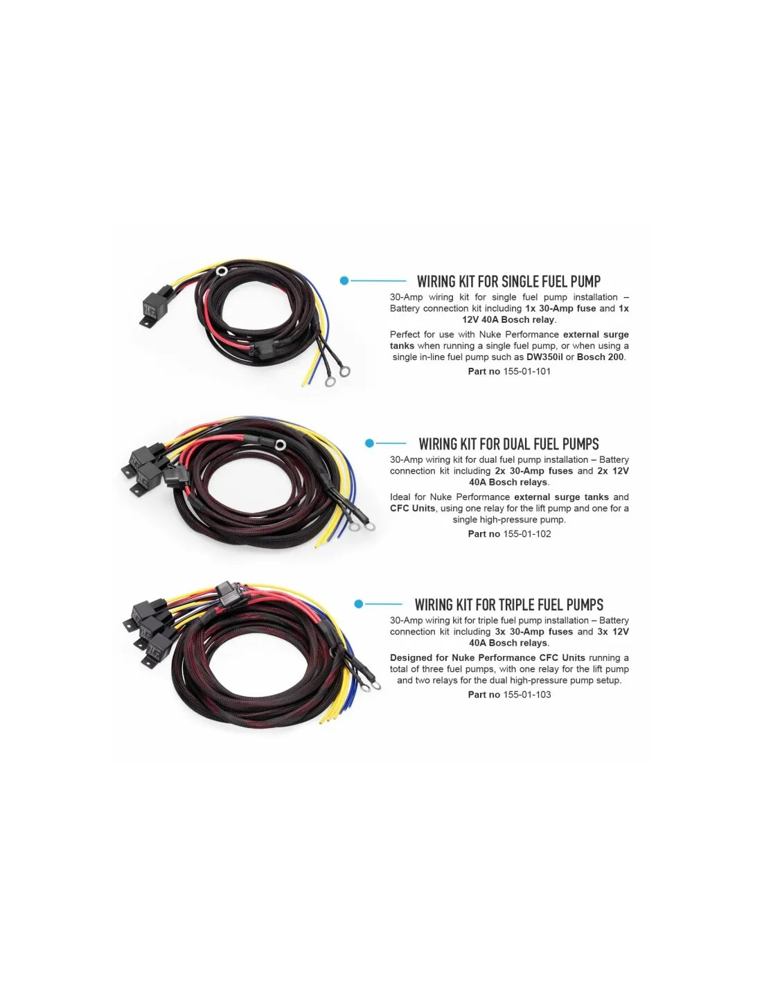 Les kits de câblage 30 A Nuke Performance sont conçus pour assurer une alimentation électrique fiable et sécurisée à vos pompes à carburant haute performance. Que vous utilisiez une, deux ou trois pompes dans votre système, ces kits vous garantissent une installation professionnelle avec une compatibilité parfaite avec les réservoirs tampons externes et les unités CFC Nuke Performance.