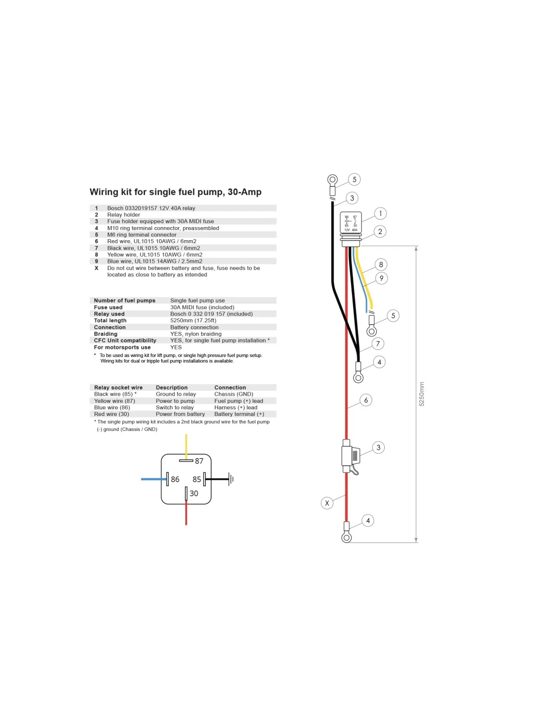 Kit de câblage 30 ampères pour l’installation d’une seule pompe à carburant – Connexion à la batterie incluant 1 fusible 30 A et 1 relais Bosch 12V 40A.