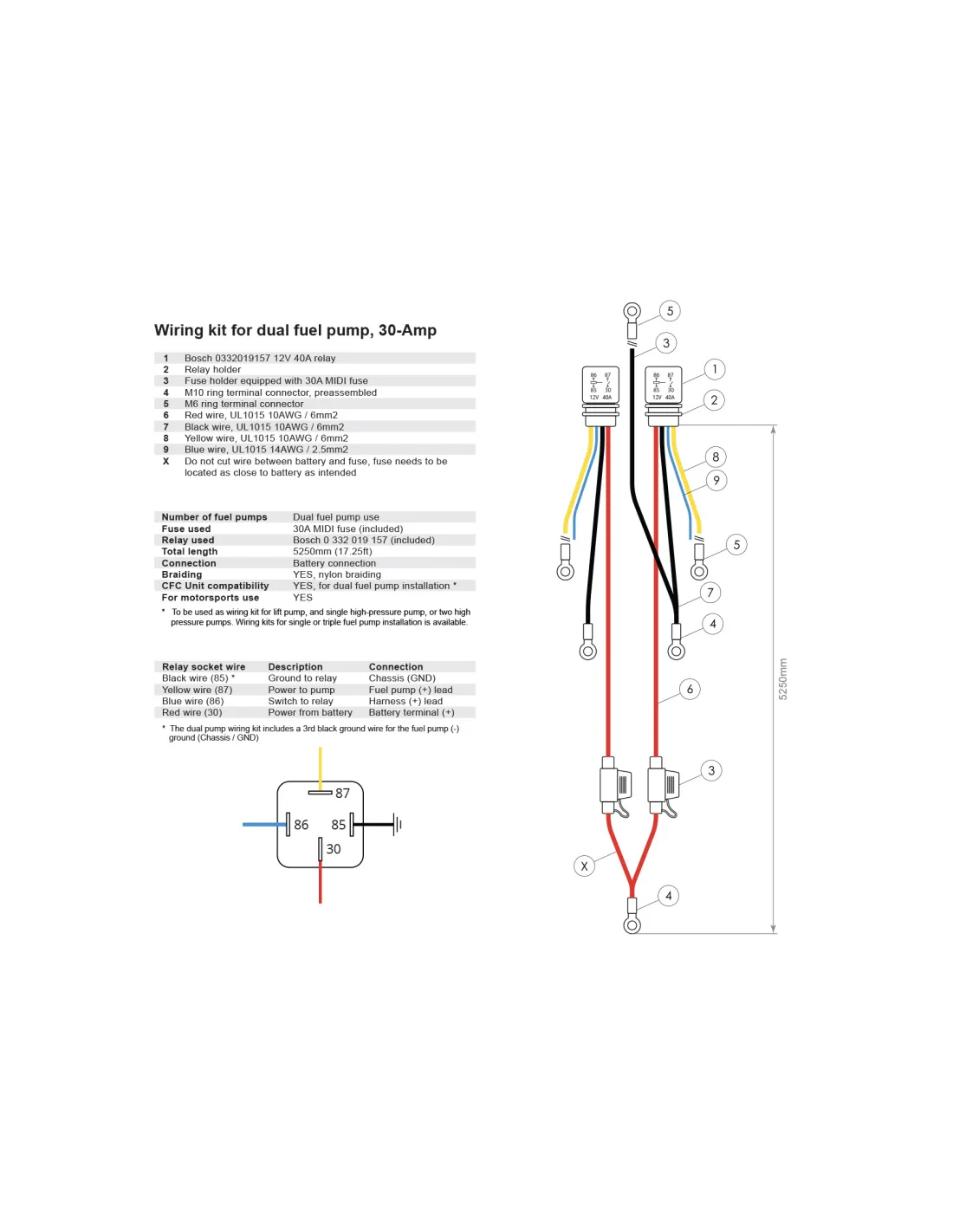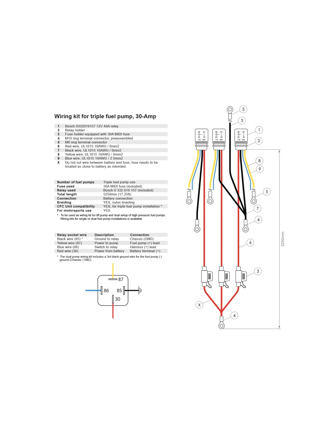Kit de câblage 30 ampères pour l’installation de trois pompes à carburant – Connexion à la batterie incluant 3 fusibles 30 A et 3 relais Bosch 12V 40A.