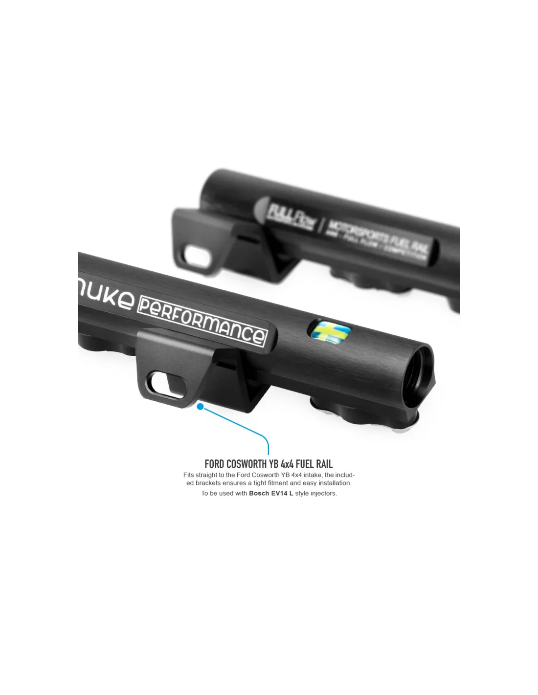 Rampe d'injection Nuke Performance pour moteur Ford Cosworth YB 4x4, avec conduits internes surdimensionnés, conception légère et équipée de clips de sécurité pour injecteurs exclusifs.