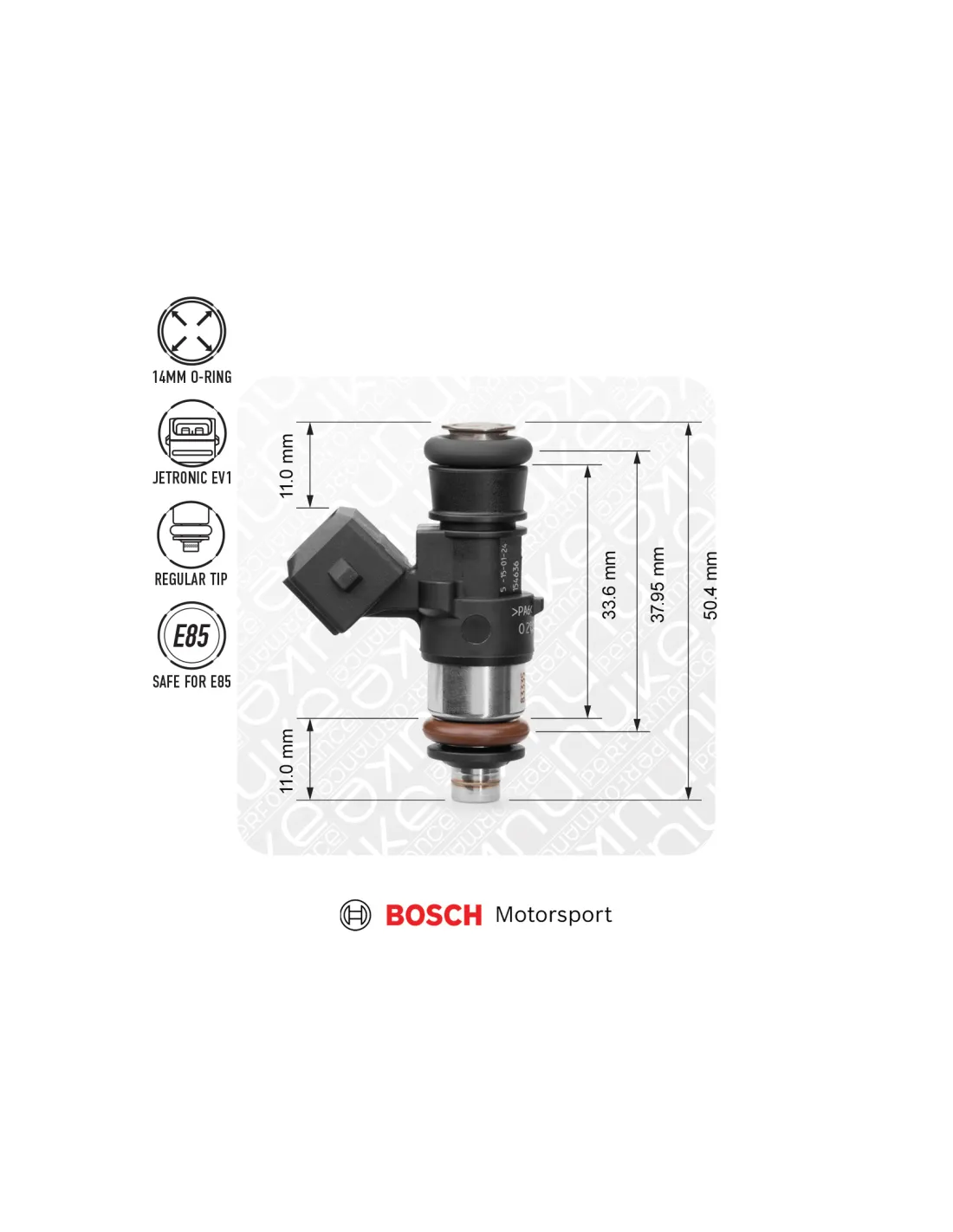 Injecteur haute performance Bosch EV14K Compact, débitant 1462 cc/min. Sa conception compacte (33,60 mm entre joints toriques / 37,95 mm centre à centre) le rend parfaitement compatible avec les rampes d'injection de la gamme Nuke Performance.