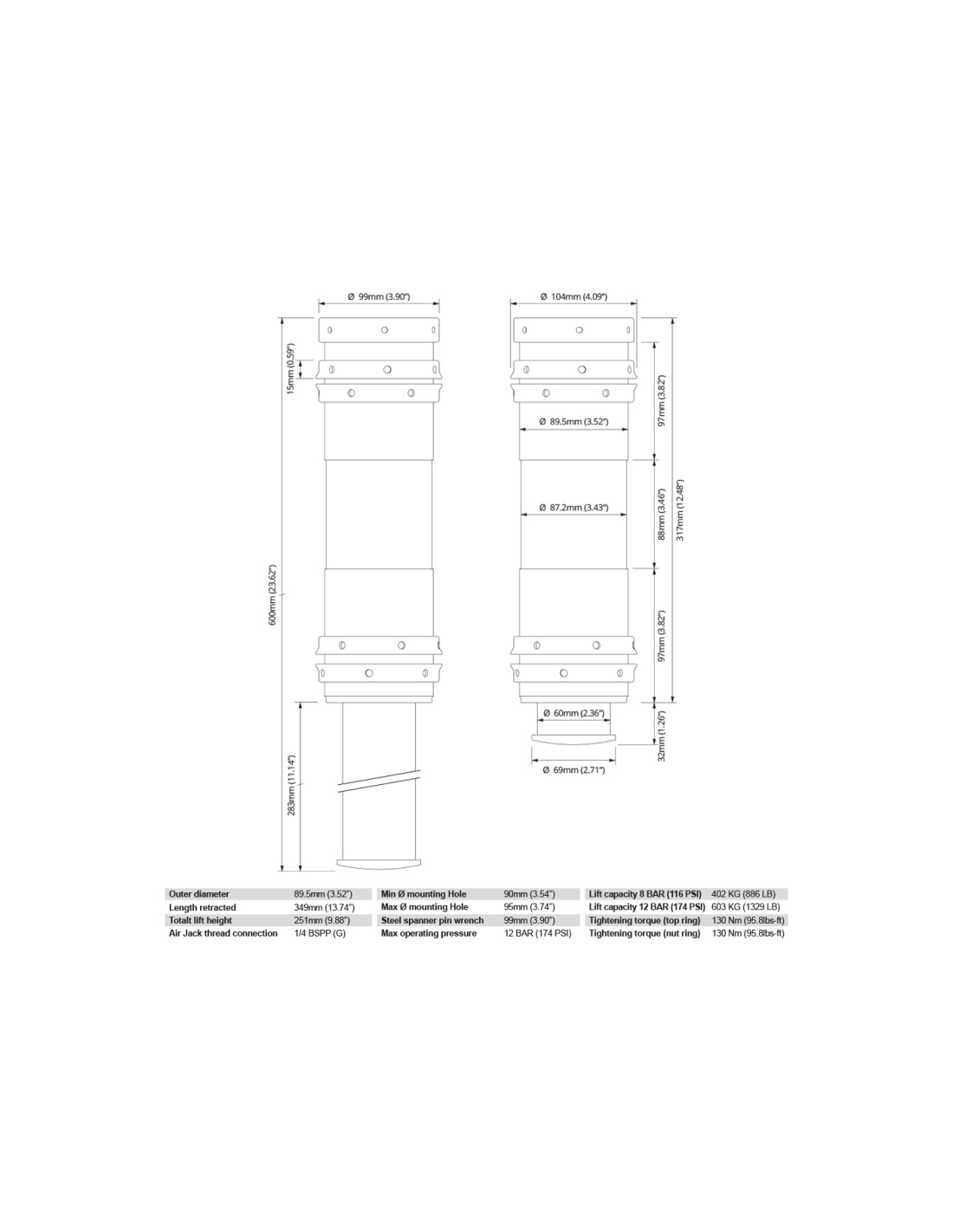 - Chacun soulève 402 kg / 886 lb à une pression aussi basse que 8 BAR / 120 PSI