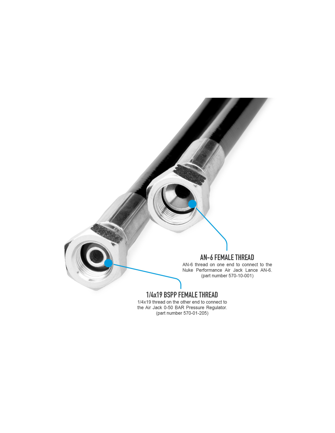 * Le raccord AN-6 ORB vers AN-6 mâle (numéro de pièce 700-04-101) est inclus, utilisé pour se connecter à la lance à air comprimé Nuke Performance, numéro de pièce AN-6 570-10-001.